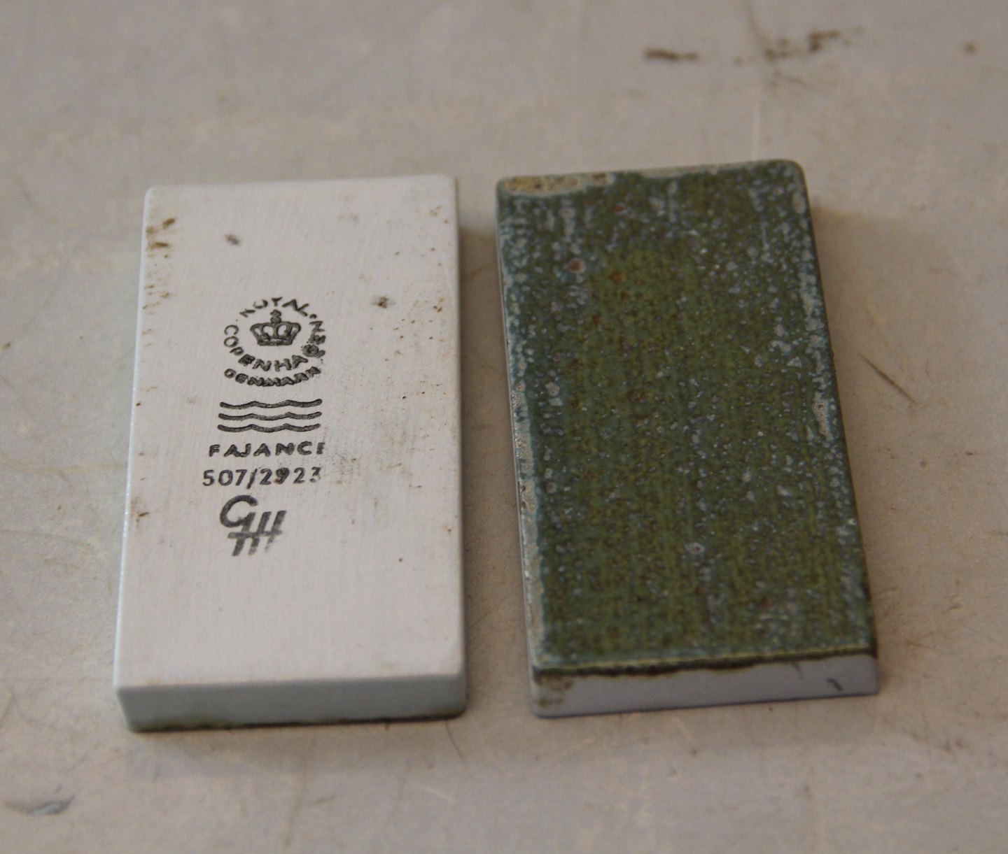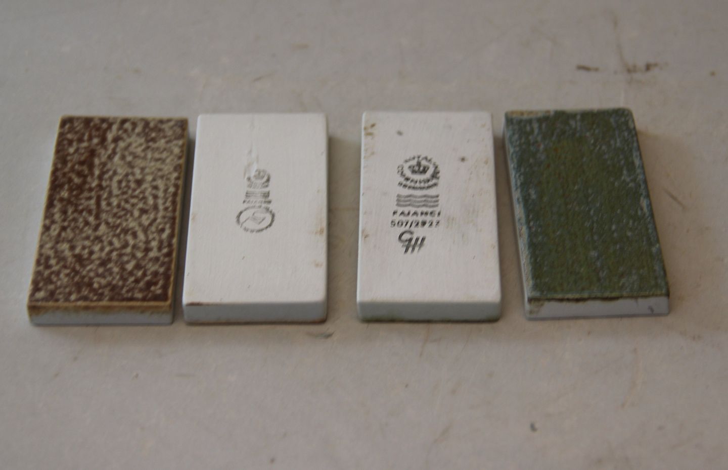 Beskrivelse: Fajancefliser 2923-520 7.5 x 3.7 cm Grøn Grethe Helland Hanssen x 3 stk kr 75