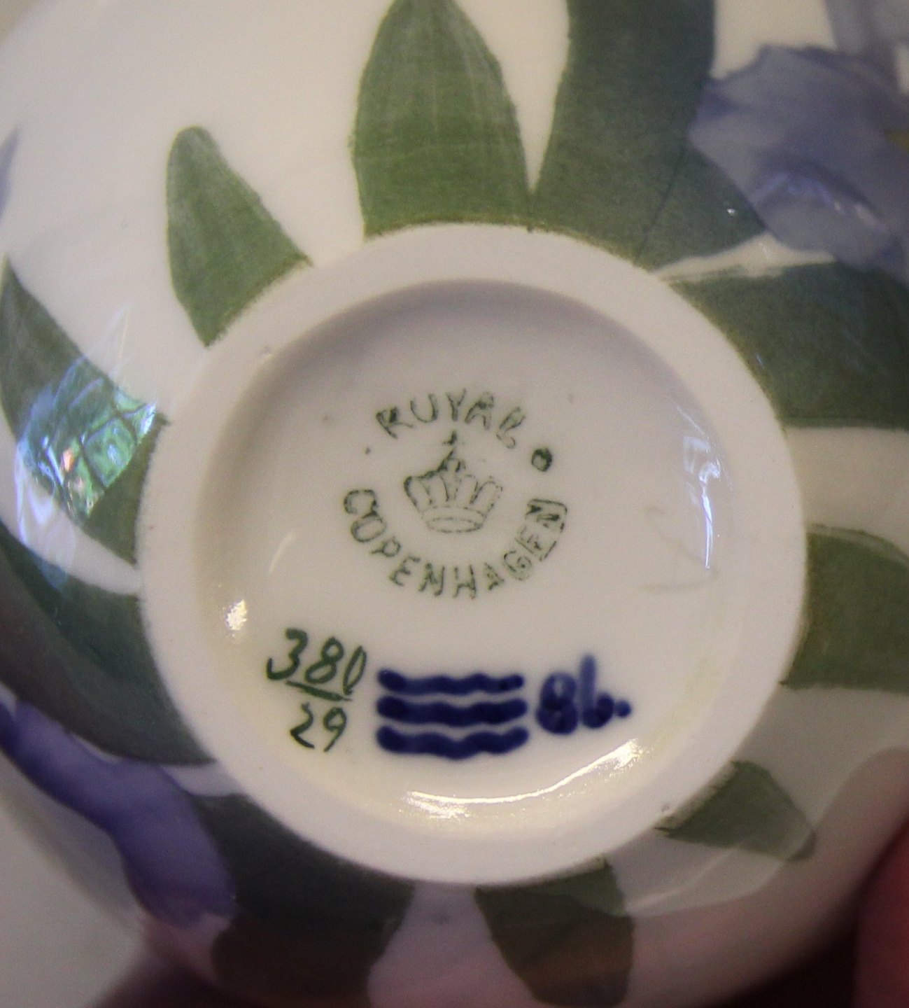 Beskrivelse: Kgl. 380-29 Art Noveau Vase med hank- dekoreret med blå iris 19 cm præ 1923 fra Royal Copenhagen I hel og fin stand Hankevase