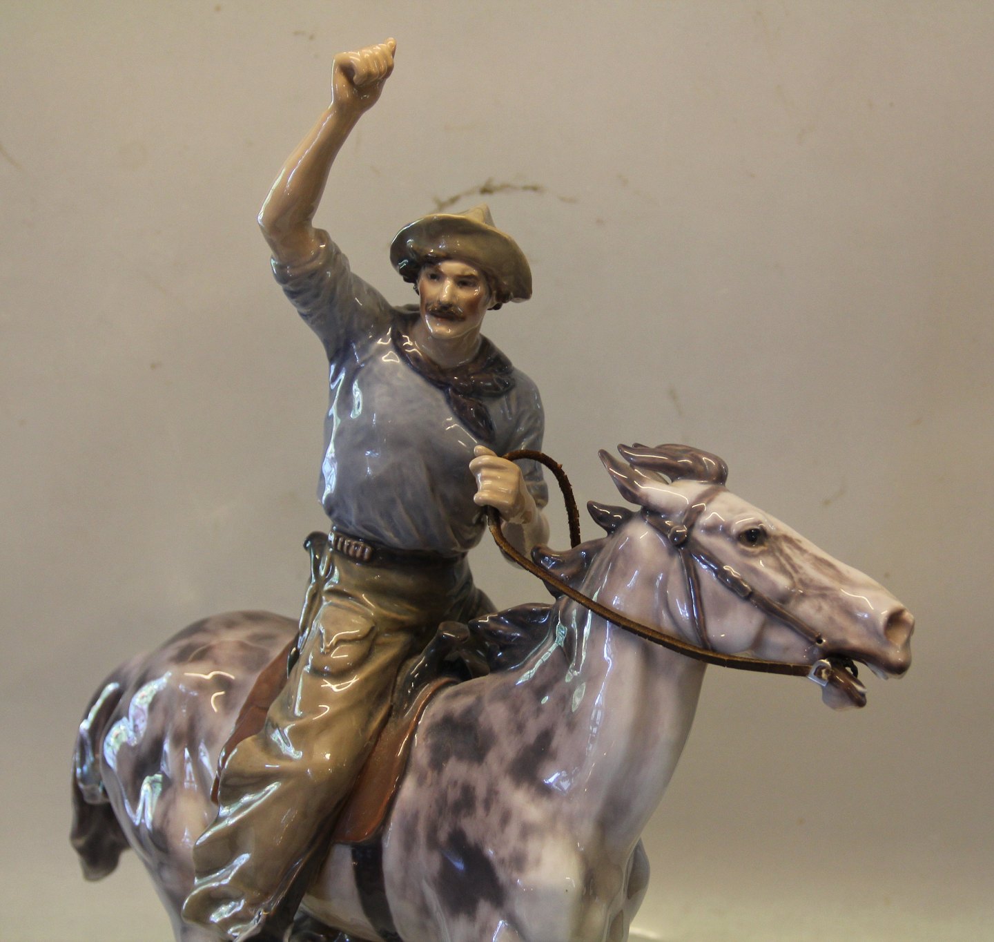 Beskrivelse: Dahl Jensen 1266 Cowboy til hest 41,5 cm (LJ). Mærket med kongelig krone og DJ Copenhagen i hel og fin stand. Laurtiz Jensen 1859-1935