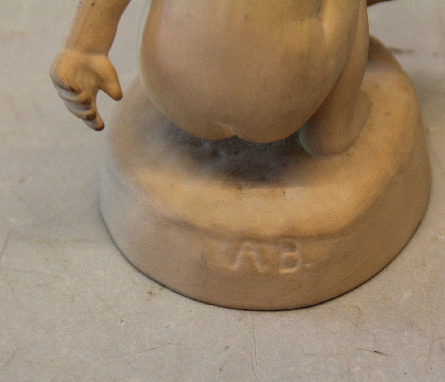 Beskrivelse: 43 Arbejdslyst (Pige med skovl) Adda Bonfils 13,5 cm 889 glasur Keramik fra P. Ipsens Enke Kgl. Hof. Terracottafabrik 1843-1955