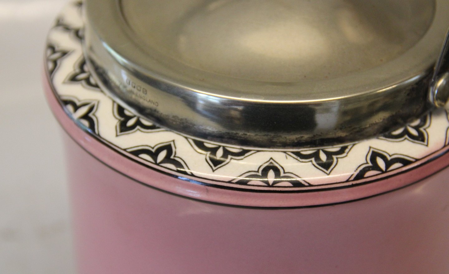 Gammel engelsk kiksespand med forsølvet låg - rosa fajance 5867 ca 17 cm høj