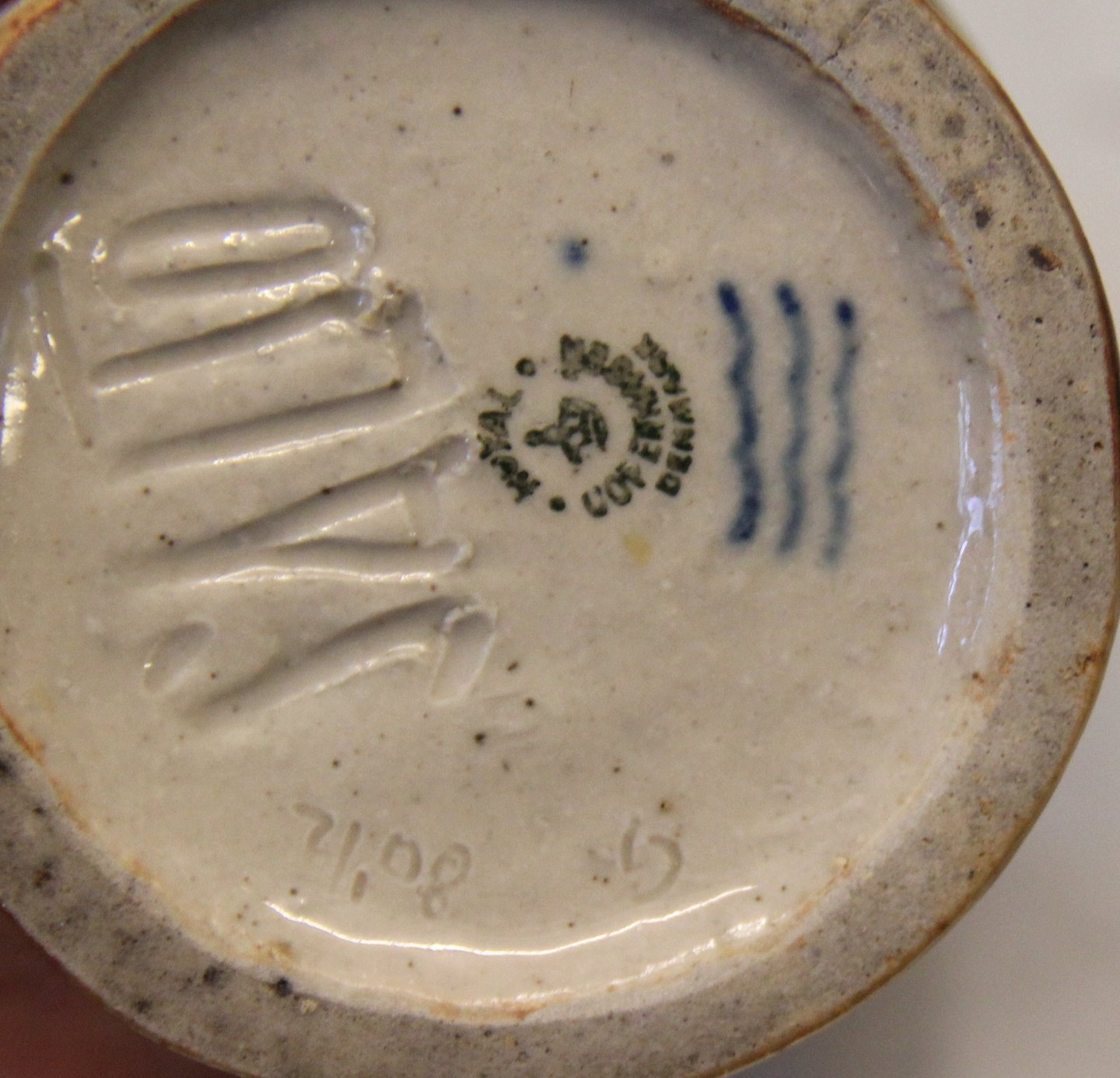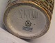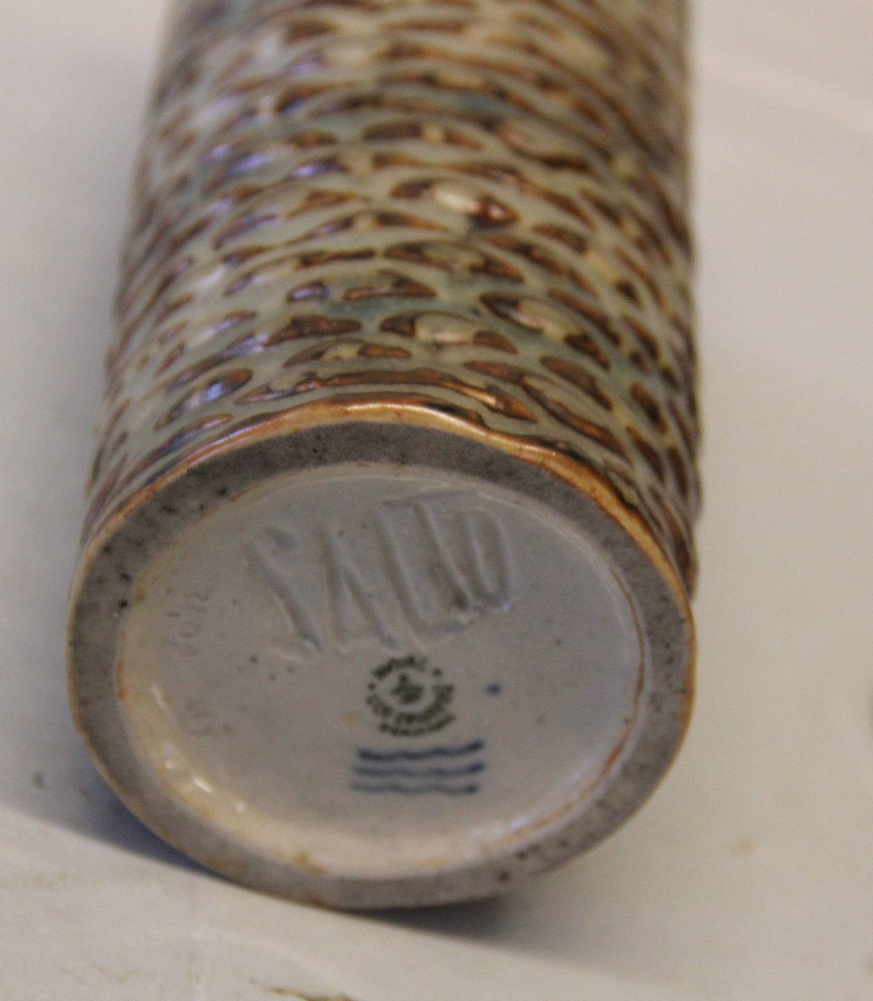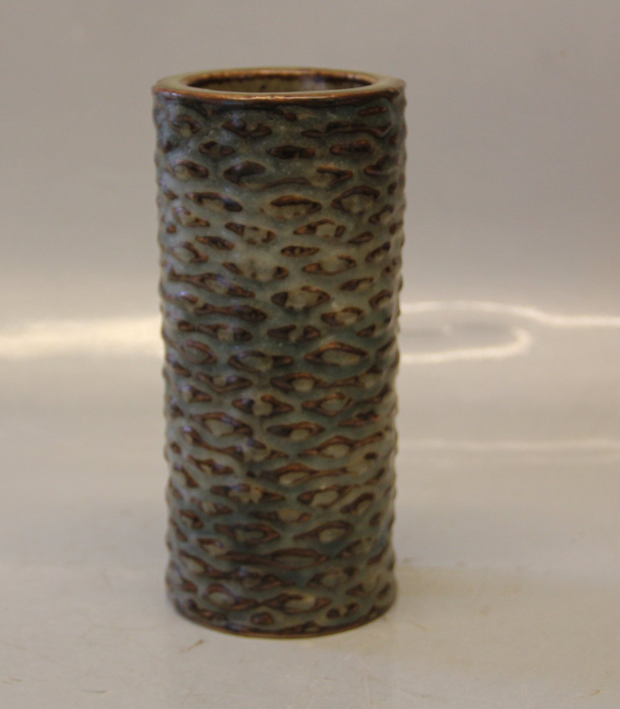 Beskrivelse: Axel Salto (1889-1961) for Royal Copenhagen Stentøj. Saltovase i Cylindrisk, vertikalt knopret i relief 17 x 8 cm med 23 vertikale rækker ovale / rombeformede knopper, grønbrun glasur. Betegnet Salto Produktionsår 1949 streg over N i Copenhagen og tre bølgelinier. Utydeligt nummereret men højst sandsynligt # Kgl. 20565. Men den er lidt større og anderledes varieret i mønsteret. Så det kan være et unika der ikke er ført til katalogs. Præget Nr 80½ i godset og et utydelig bogstav. 1 sortering I perfekt stand