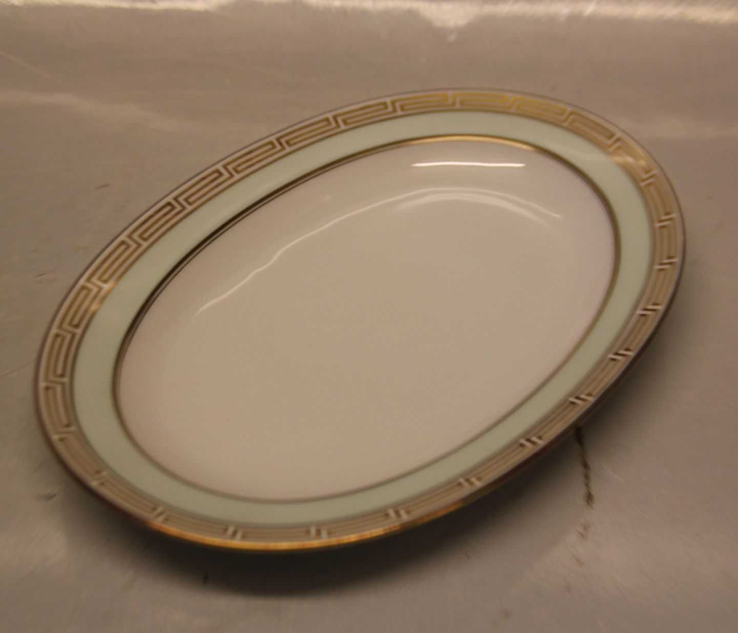 039 Ovalt Fad 22.7 cm x 15 cm Kageskål Marstrand Bing & Grøndahl B&G : Hvidt porcelæn, antik græsk kantet guldbort, pastel grøn, guldkantet spejl, form 601 I fin og hel stand Bing & Groendahl