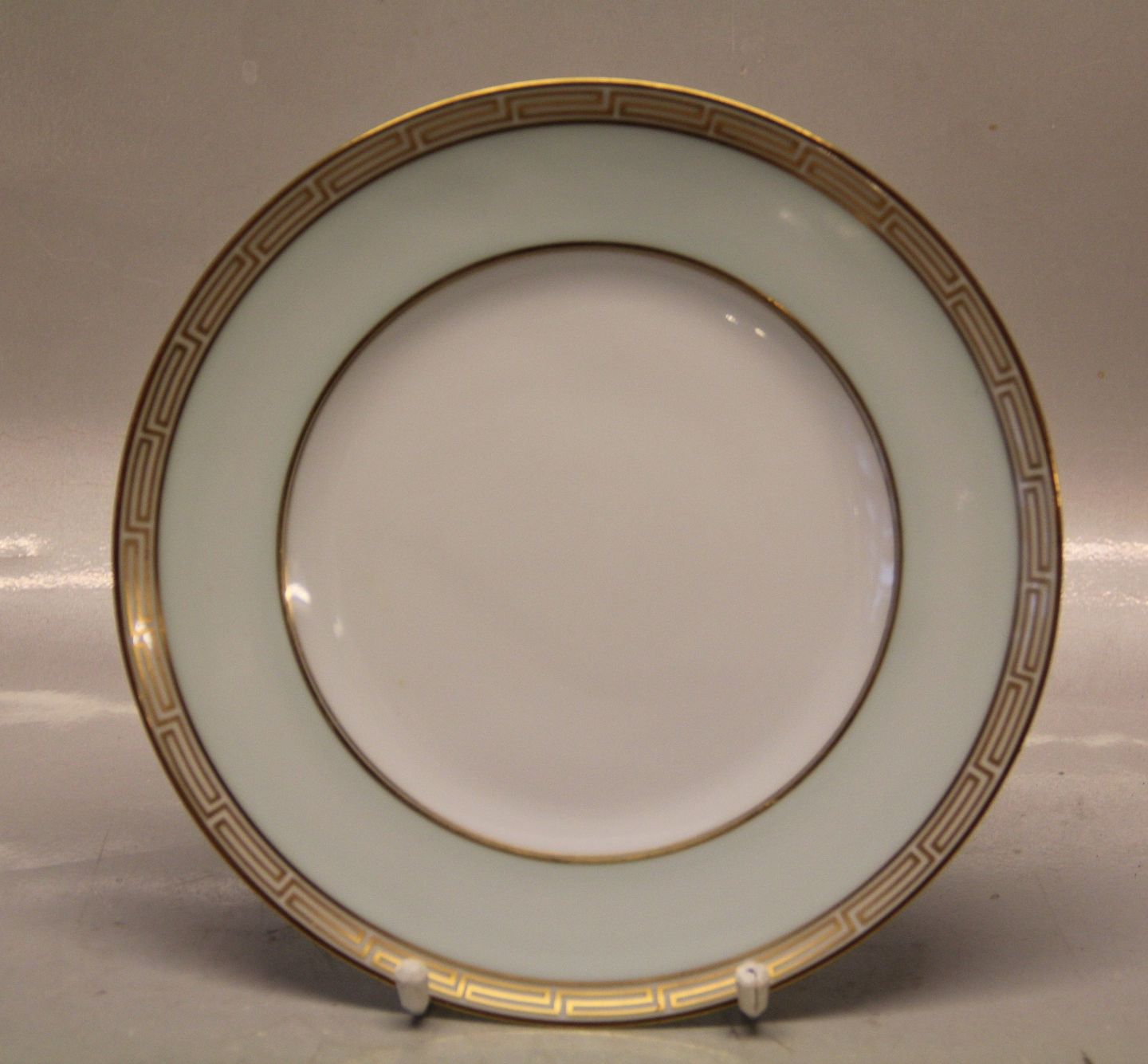 026 Frokosttallerken 21,5 cm (326) Marstrand Bing & Grøndahl B&G : Hvidt porcelæn, antik græsk kantet guldbort, pastel grøn, guldkantet spejl, form 601 I fin og hel stand Bing & Groendahl