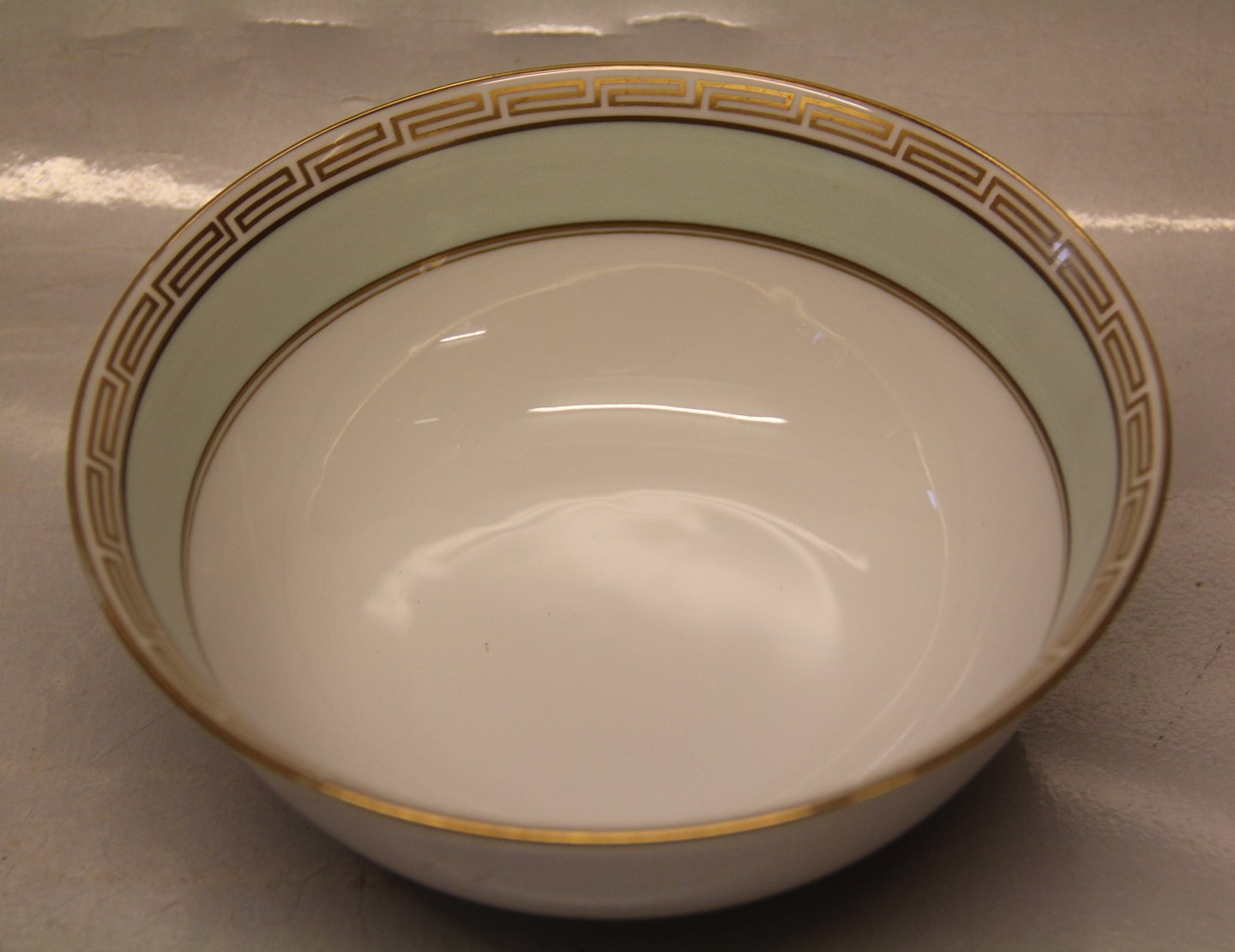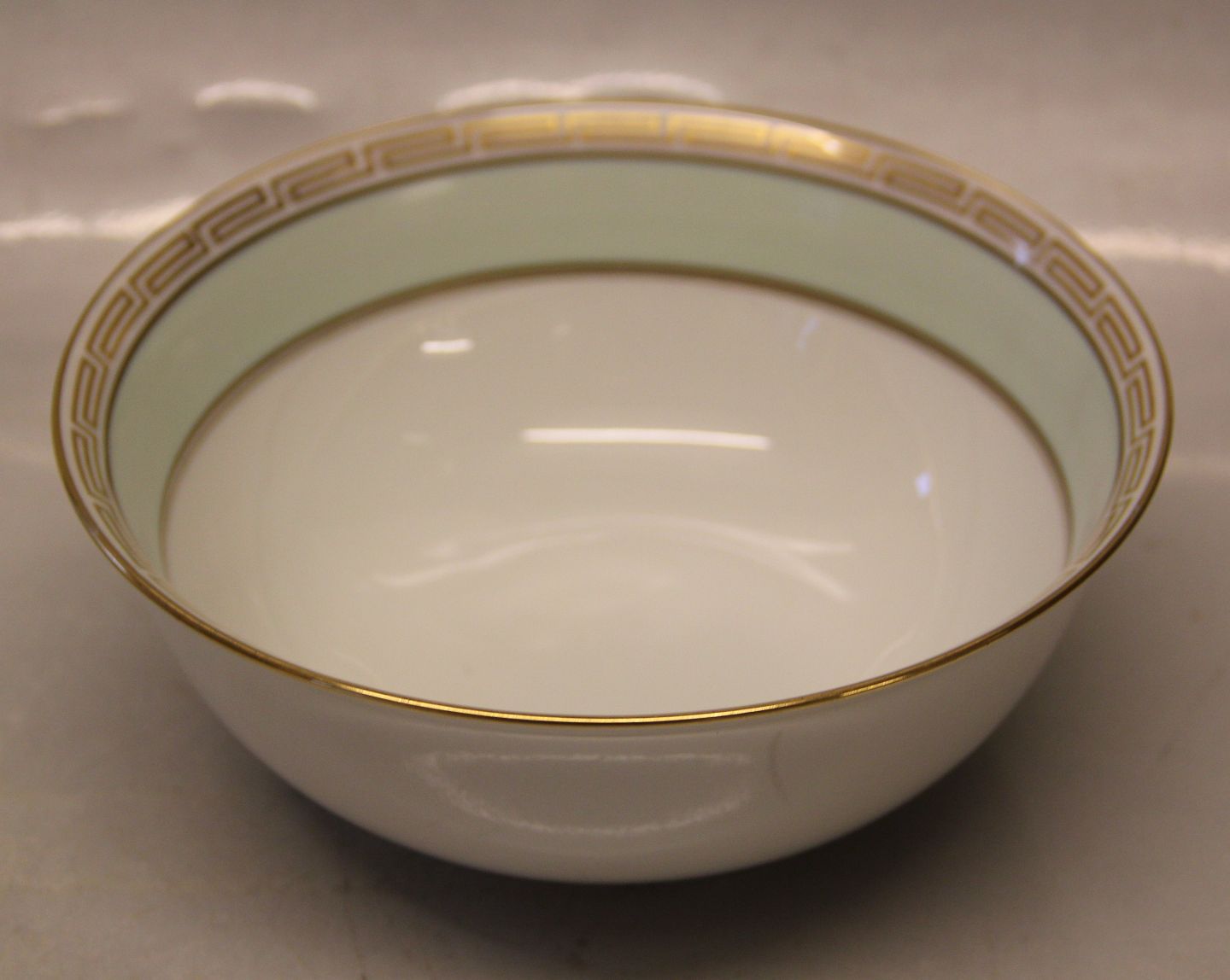 044 Rund skål 7 x 18 cm (312) Marstrand Bing & Grøndahl B&G : Hvidt porcelæn, antik græsk kantet guldbort, pastel grøn, guldkantet spejl, form 601 I fin og hel stand Bing & Groendahl