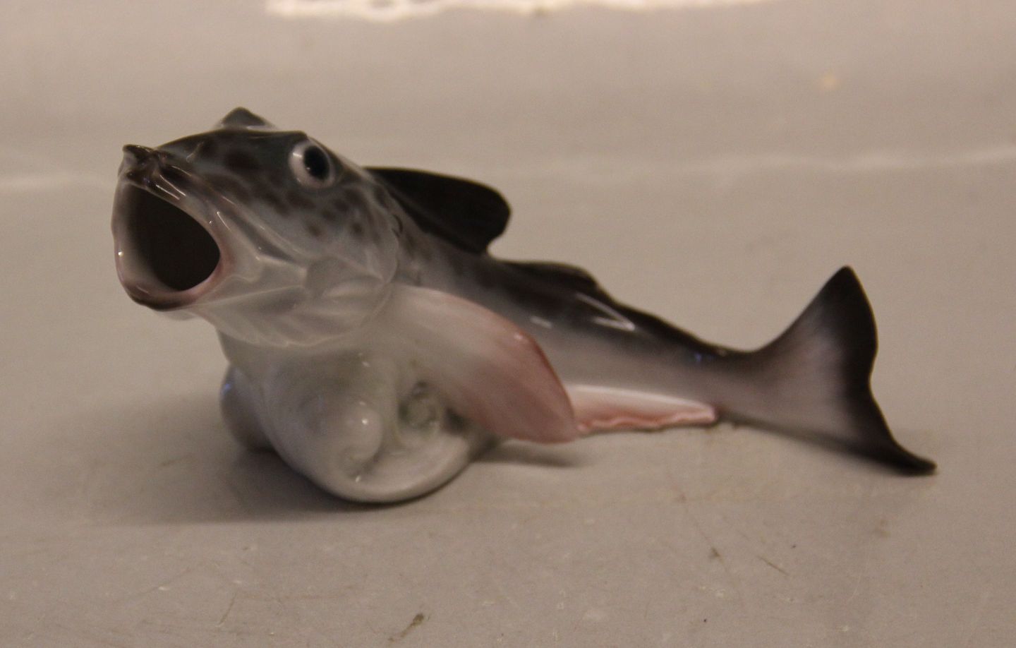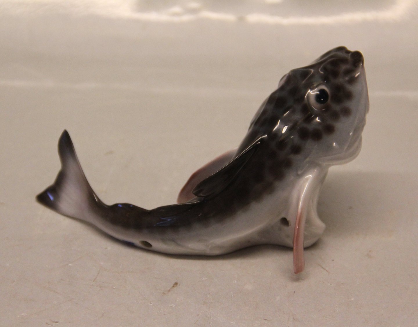 Beskrivelse: 0286 Kgl. fisk med åben mund Malle (Siluriformes) Chr. T 1901 16 cm fra Royal Copenhagen I hel og fin stand