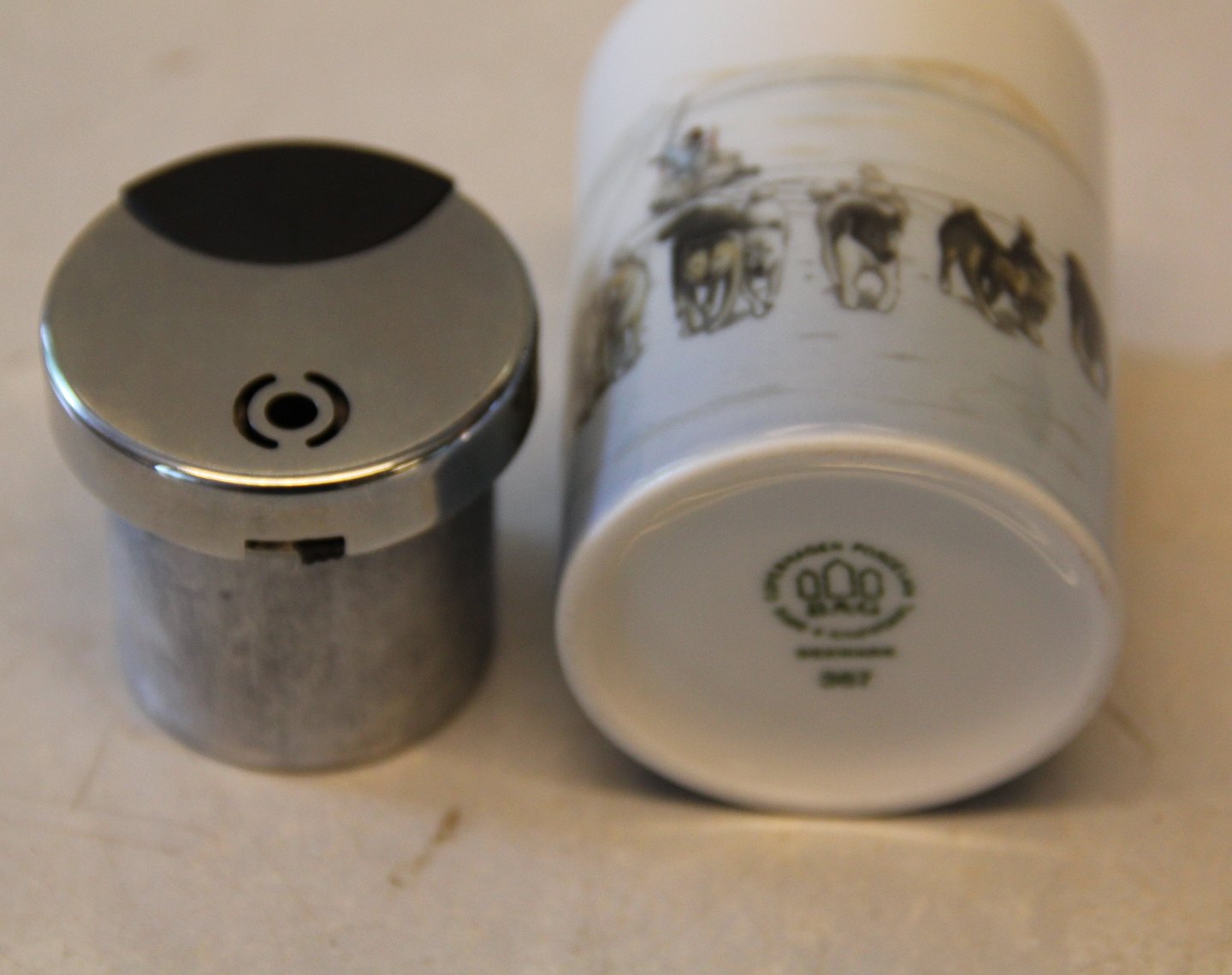 367 Bordligther med Hundeslæde - Qimusseq 8.5 cm Bing & Grøndahl Grønlandske Mågestel med guldkant. I hel og fin stand. Lave med udgangspunkt i mågestellet