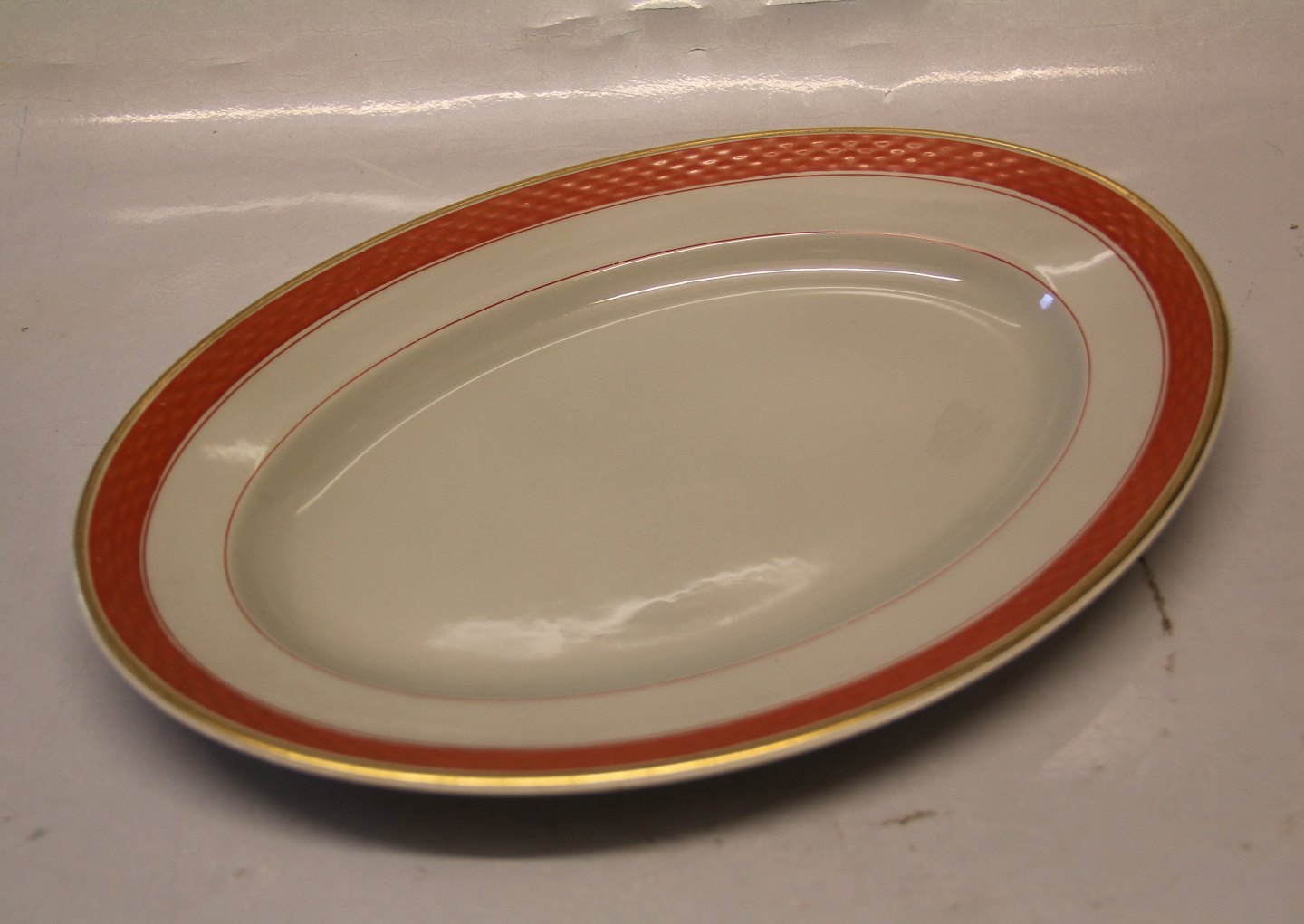 Ovalt fad 28 cm Alluminia Tureby Stel Dekoration 254 Design Nils Thorsson 1934 Rødt bånd og guld Håndmalet på Viktoria III Turreby