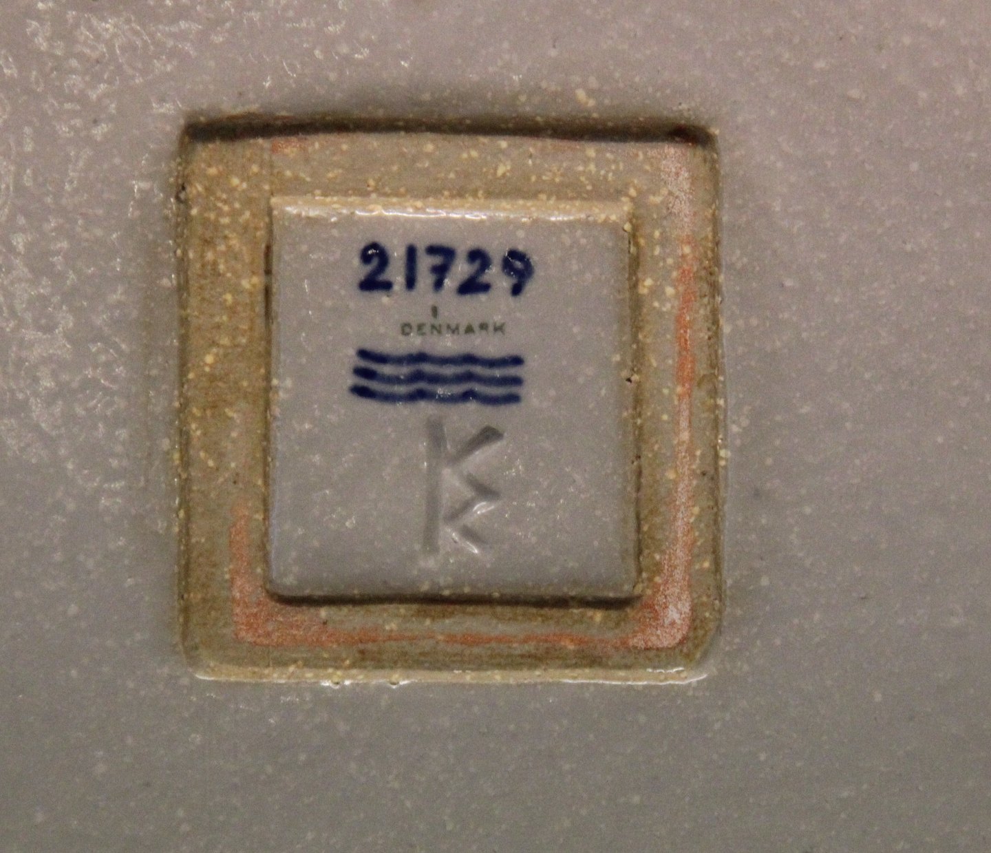 Royal Copenhagen Stoneware. In nice and mint condition'Knud Kyhn (1880-1969): painter and sculptor, Worked at Royal Copenhagen Factory most of his working life in periods: 1903-1908; 1923-1932 and free lance more and less from 1936- 1968. In between he worked at Herman A Kahler, Naestved 1918-1924 and Bing & Grondahl 1910-1914 and 1933-1935. Together with his wife he had a small ceramic workshop in Farum, where he created and sold art pottery in his own name.