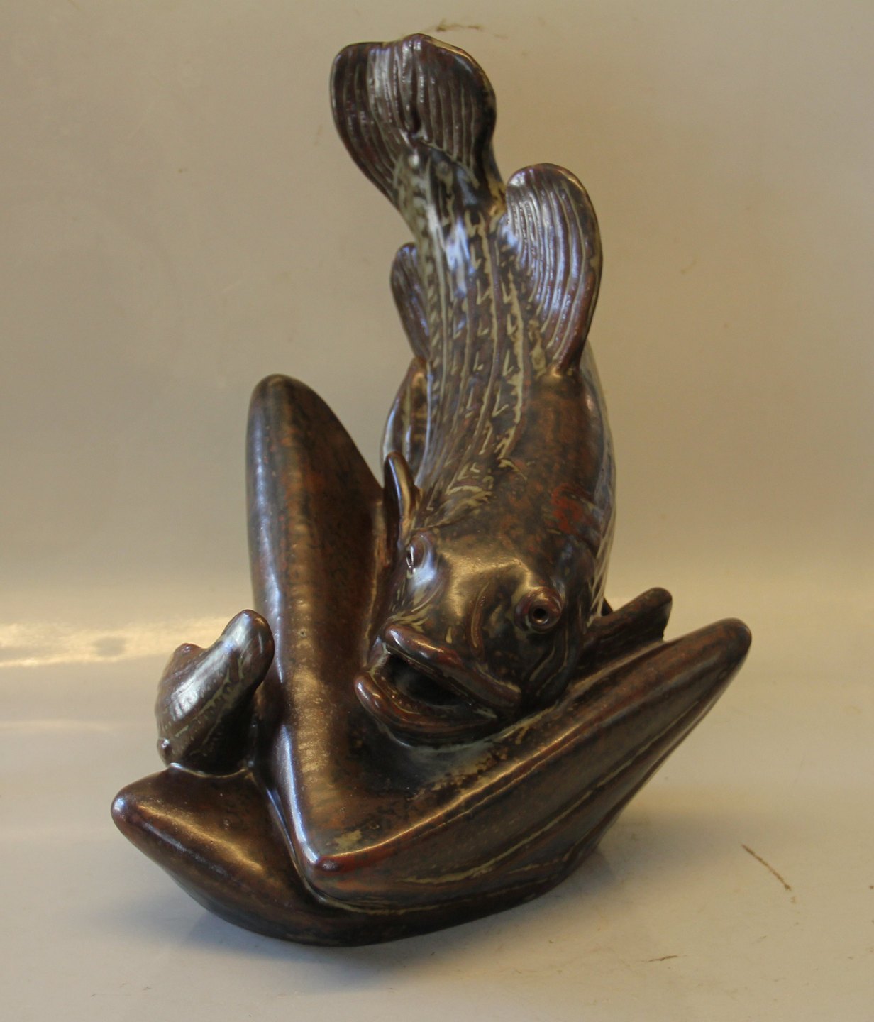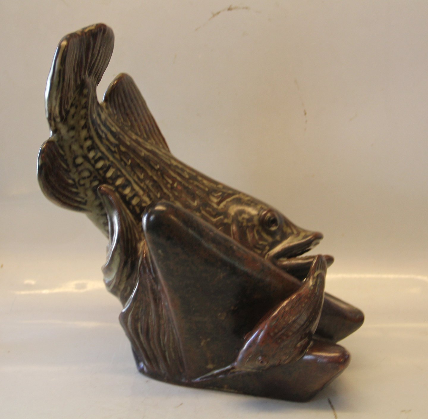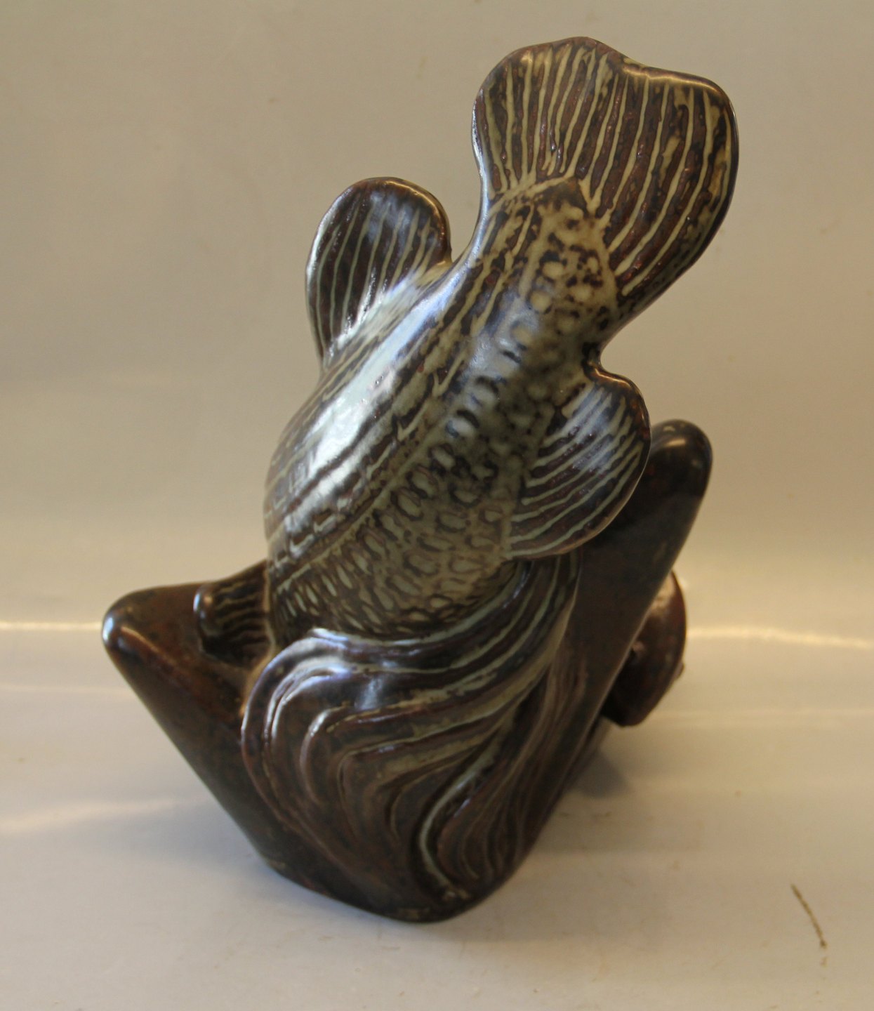 Unika Kgl. Fiskeskulptur 34 x 31 x 27 cm Jørgen Mogensen dilou glasur præ 1964 Kongelig Dansk Stentøj