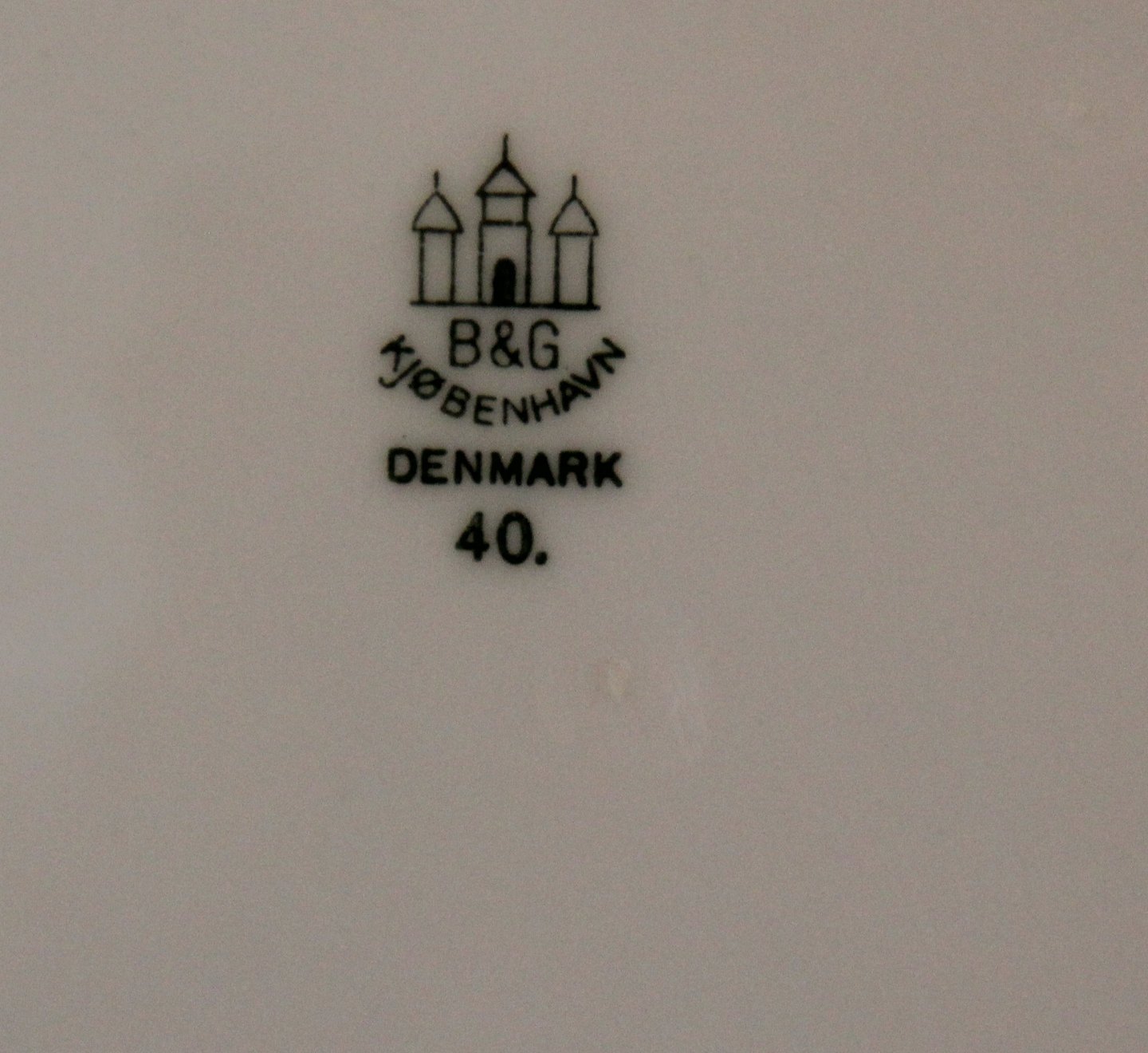 040 Trekantet kage fad 24 cm (354) Bing & Grøndahl Roselil Hvidt kantet porcelæn med bred guldkant og strøblomster i Henriette stil. Bing & Groendahl mønster på samme form som Offenbach I hel og fin stand Rosenblomst