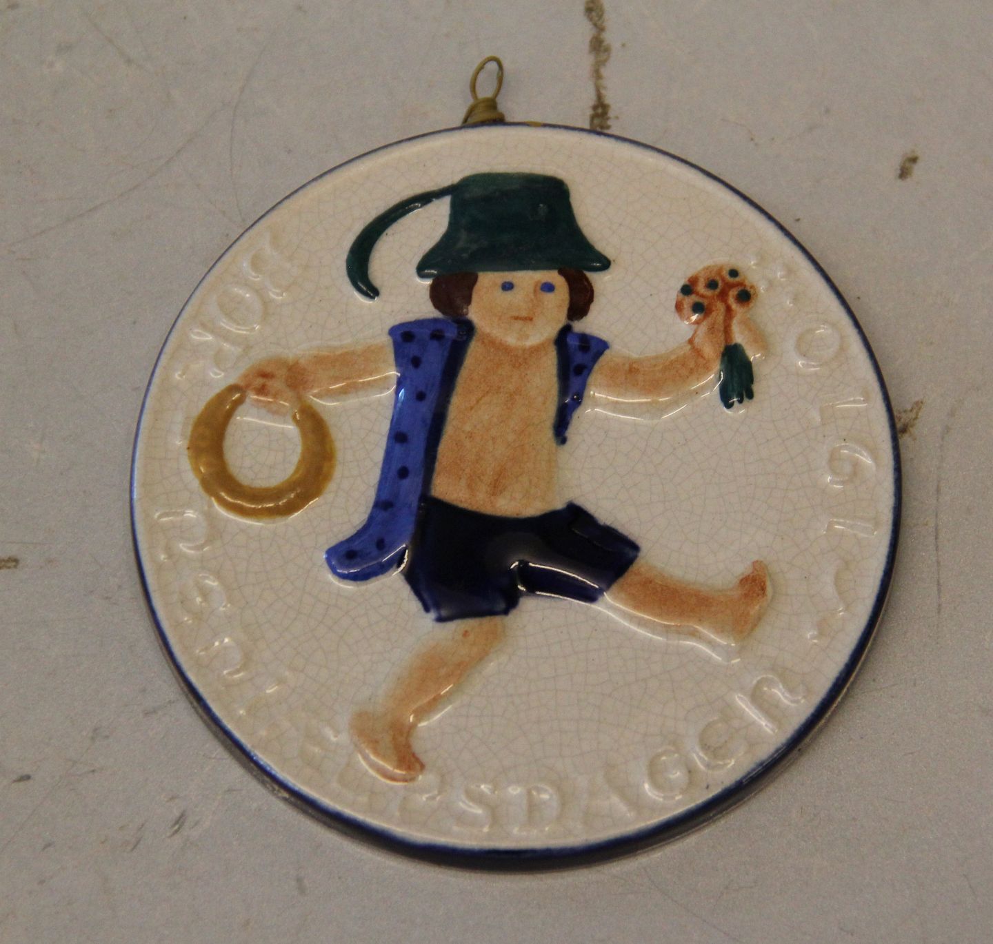 1910 Børnehjælpsdags plakette Dreng med krans og buket 1910 af Rasmus Harboe 753-659 8,7 cm Royal Copenhagen Aluminia fajance Børnehjælpsplatte