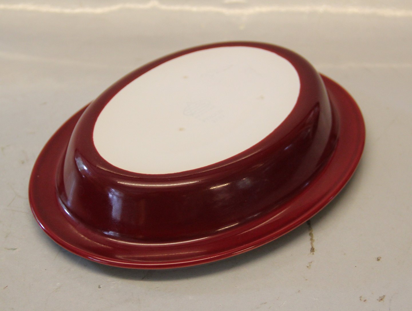 Pyrolin Vinrød med gråhvidglasur indvendig 2782 Fad, ovalt 16 x 22 cm Ingvar Olsen 1959 Royal Copenhagen Aluminia fajance