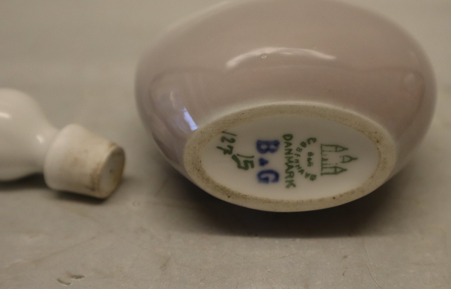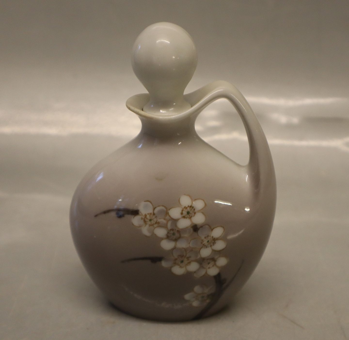 Beskrivelse: Bing & Grøndahl B&G 0015-127 Art Nouveau lille kande med prop 12 cm dekoreret med frugt blomster I fin og hel stand.