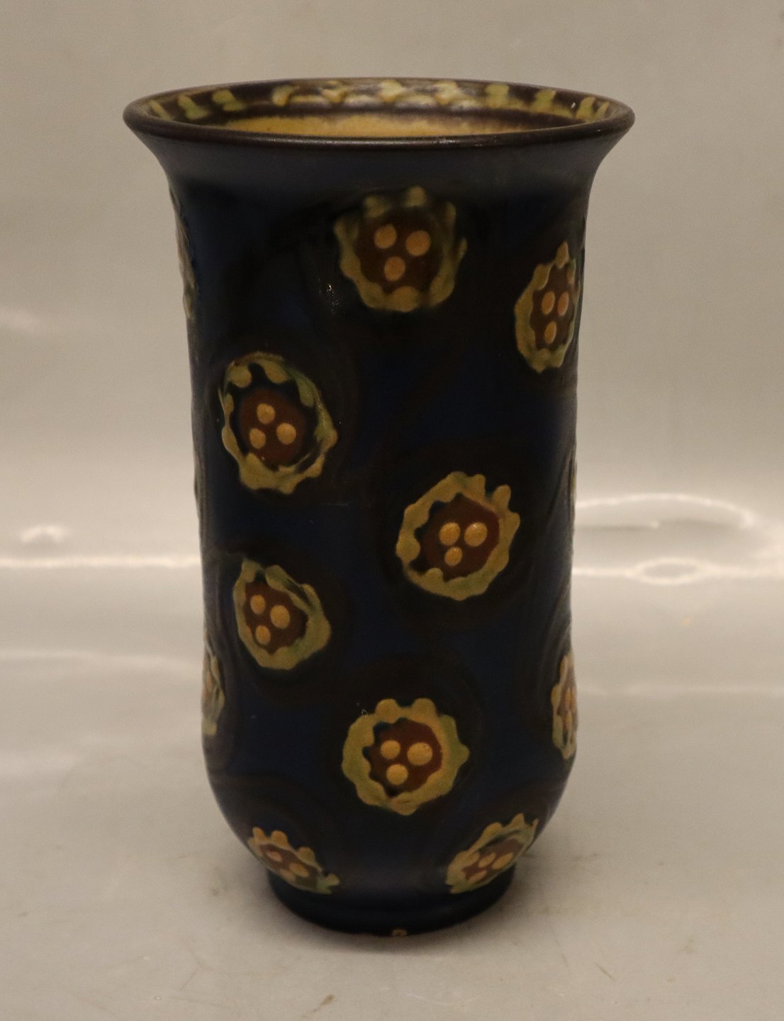Beskrivelse: Kähler Design Blå Vase 21 cm signeret HAK Danmark afslag under bund Se billede