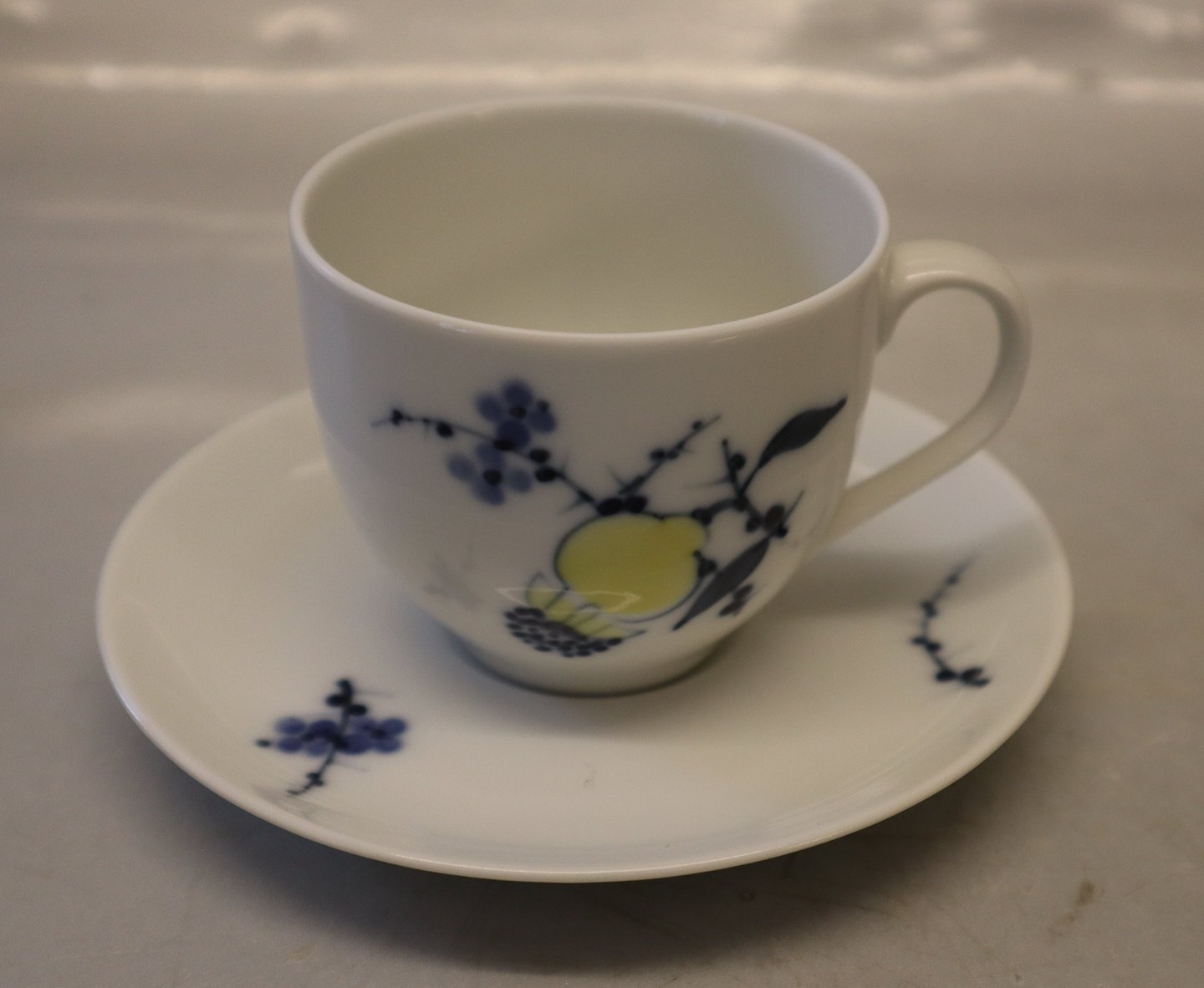46-14810 Kaffekop 6 x 7.2 cm & underkop 13 cm Royal Copenhagen Rimmon Design Johannes Hedegaard. I produktion fra 1967 - 1977. Rimmon er hebræisk for granatæble. Hvidt porcelæn med gul og blå håndmalede grene. Royal Copenhagen spise - og kaffestel