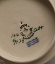 Kgl. 1010 Fensmark : Cremefarvet glasur, koralrød blomst med grønne blade, grønt bånd og guldfilet. Dekorationen med Rød Arve, populært kaldet "Grine til Middag" Det latinske navn: Ana Gallis Arvensis. Design Thorkild Olsen før 1961