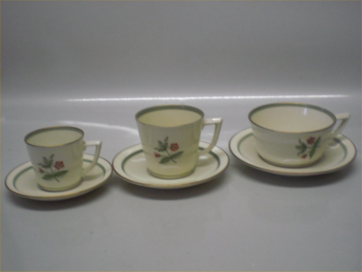 Kgl. 1010 Fensmark : Cremefarvet glasur, koralrød blomst med grønne blade, grønt bånd og guldfilet. Dekorationen med Rød Arve, populært kaldet "Grine til Middag" Det latinske navn: Ana Gallis Arvensis. Design Thorkild Olsen før 1961