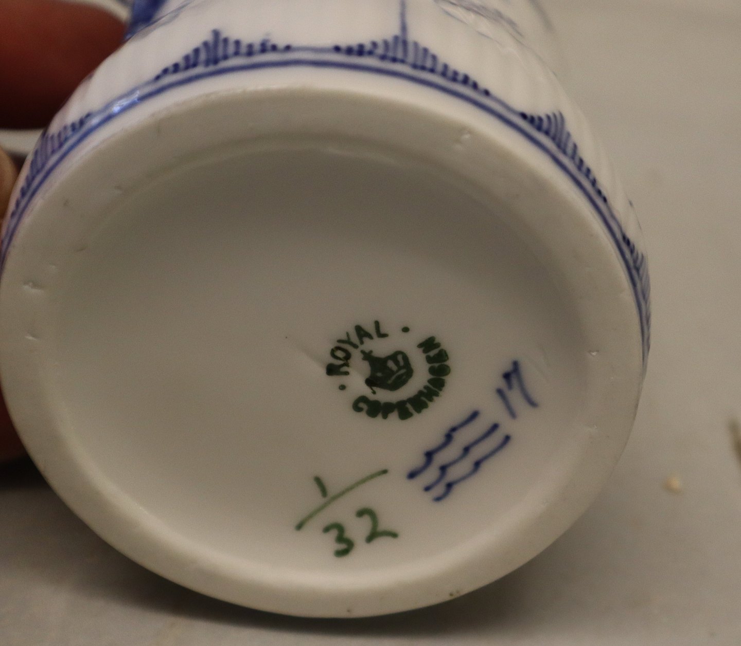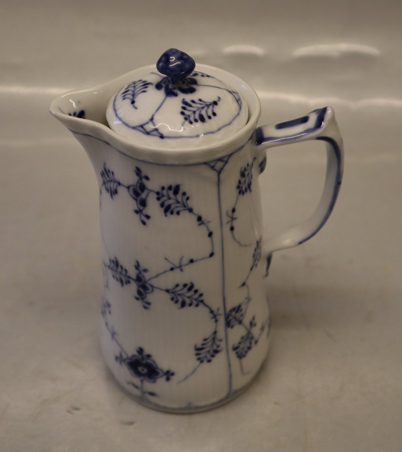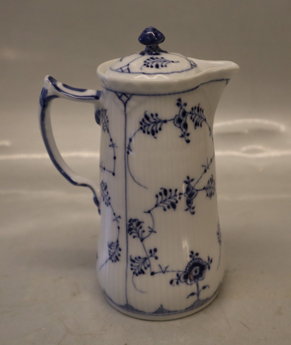 032-1 Chokoladekande med låg 0.24 liter 17 cm (2 kopper) 1. sort maler 17 før 1923 Royal Copenhagen Musselmalet riflet . Muselmalet I fin og hel stand. Passer godt sammen med andre blåmalede spise- og kaffestel