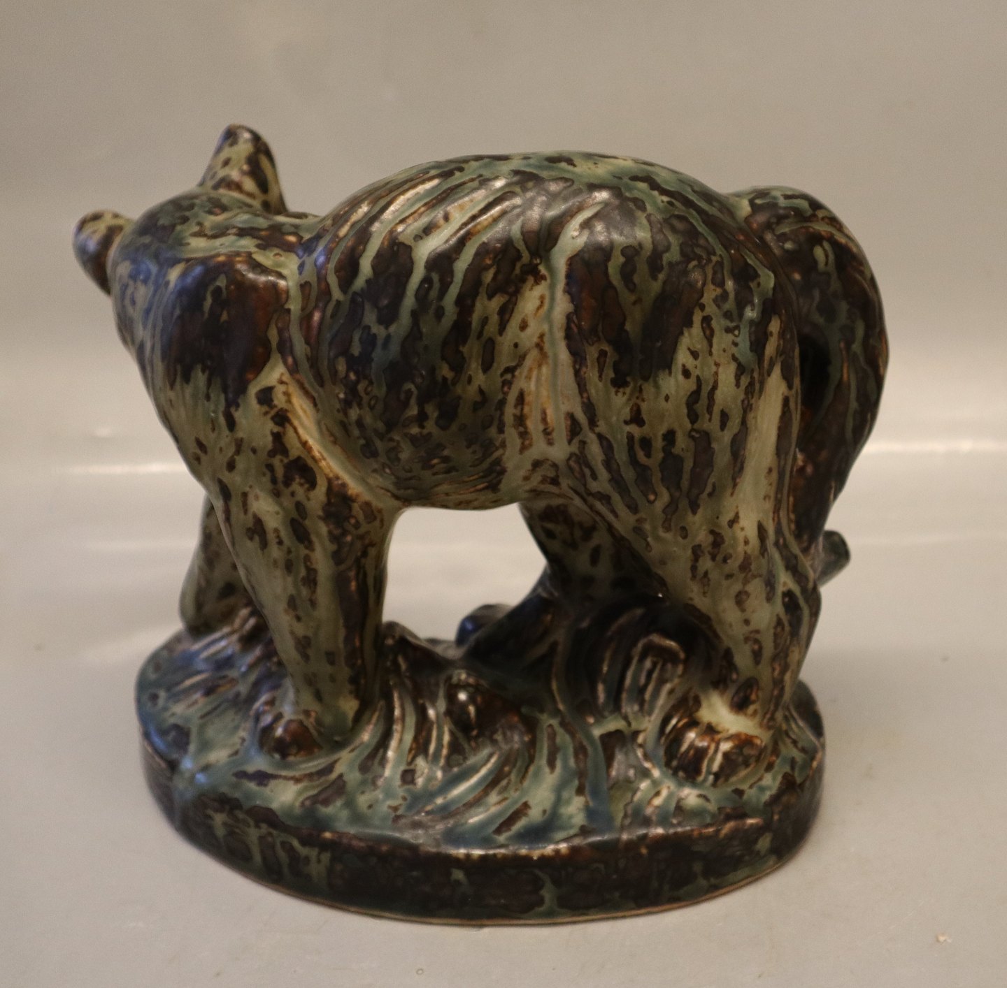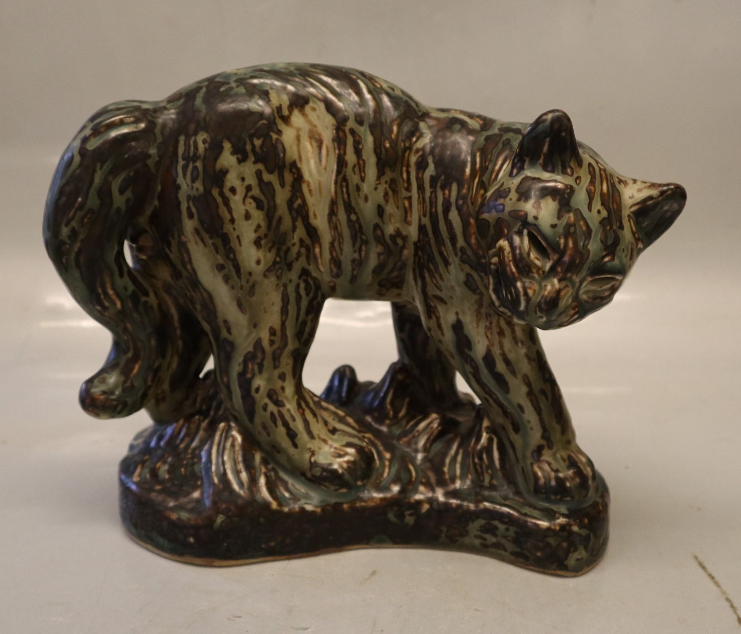 Beskrivelse: 21645 Kgl. Kat, 23 x 19 cm december 1958 Knud Kyhn Royal Copenhagen stentøj I fin og hel stand Sung Glasur