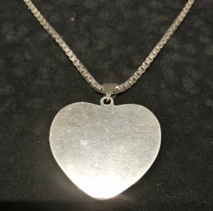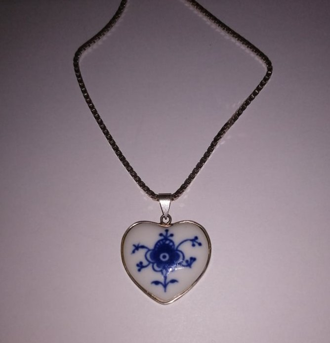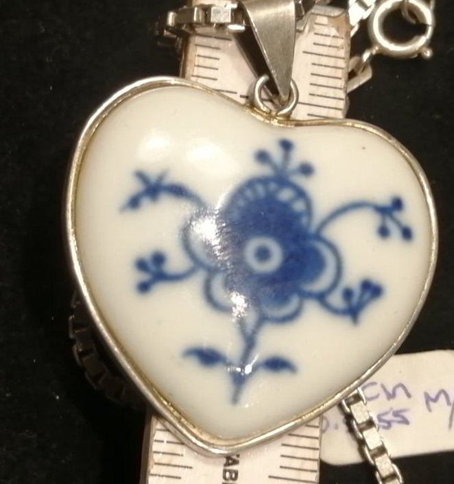 Sølvmonteret Musselmalet hjerte med sølvkæde Højde 43 mm bredde 36 mm kraftig 60 cm kæde 0.835 sølv vægt 32.9 gr samlet. Hjerte alene Ca 14 gr. Royal Copenhagen Musselmalet riflet . Muselmalet I fin og hel stand. Passer godt sammen med andre blåmalede spise- og kaffestel