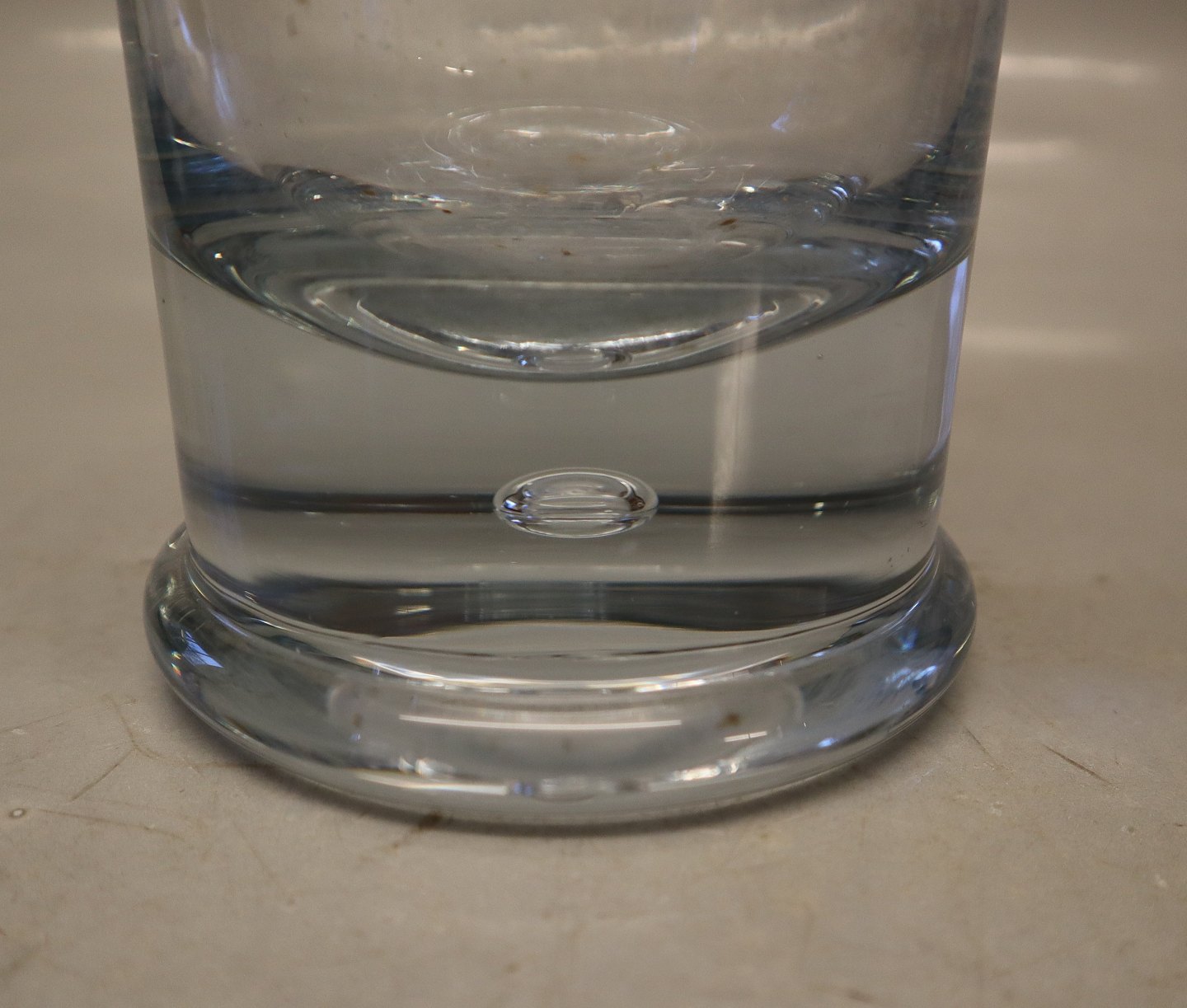 Beskrivelse: Regiment Karaffel 29.5 x 10 cm Holmegaard Glasværk, cylinderformet karaffel på tyk fod med luftboble Design Sidse Werner
