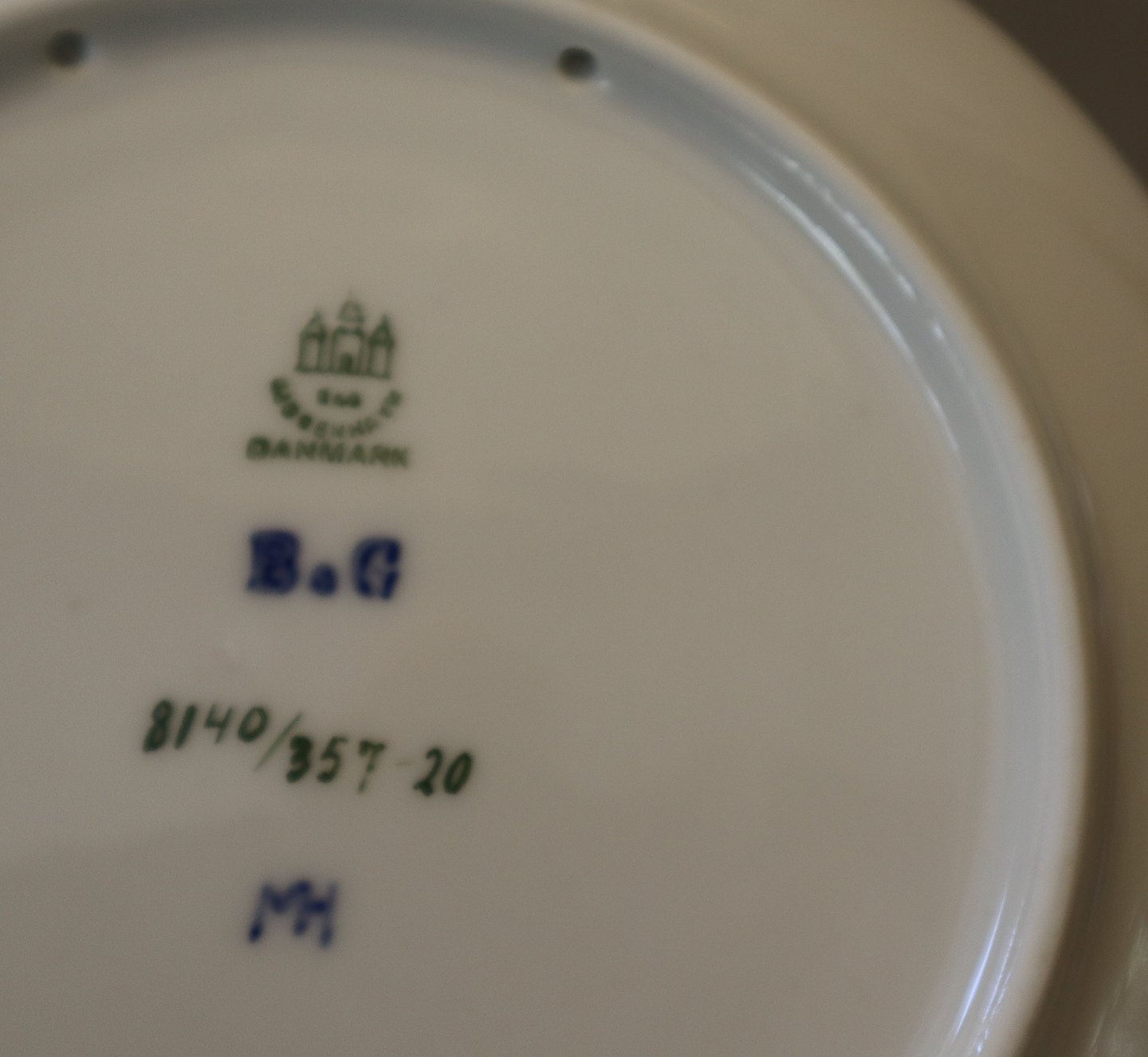 Beskrivelse: B&G 8140-357-20 Platte: Bygning ved sø 20 cm Signeret MH Margrethe Hyldahl