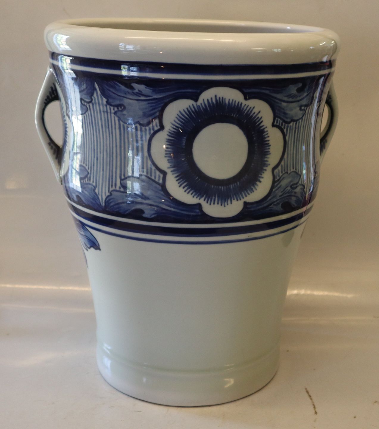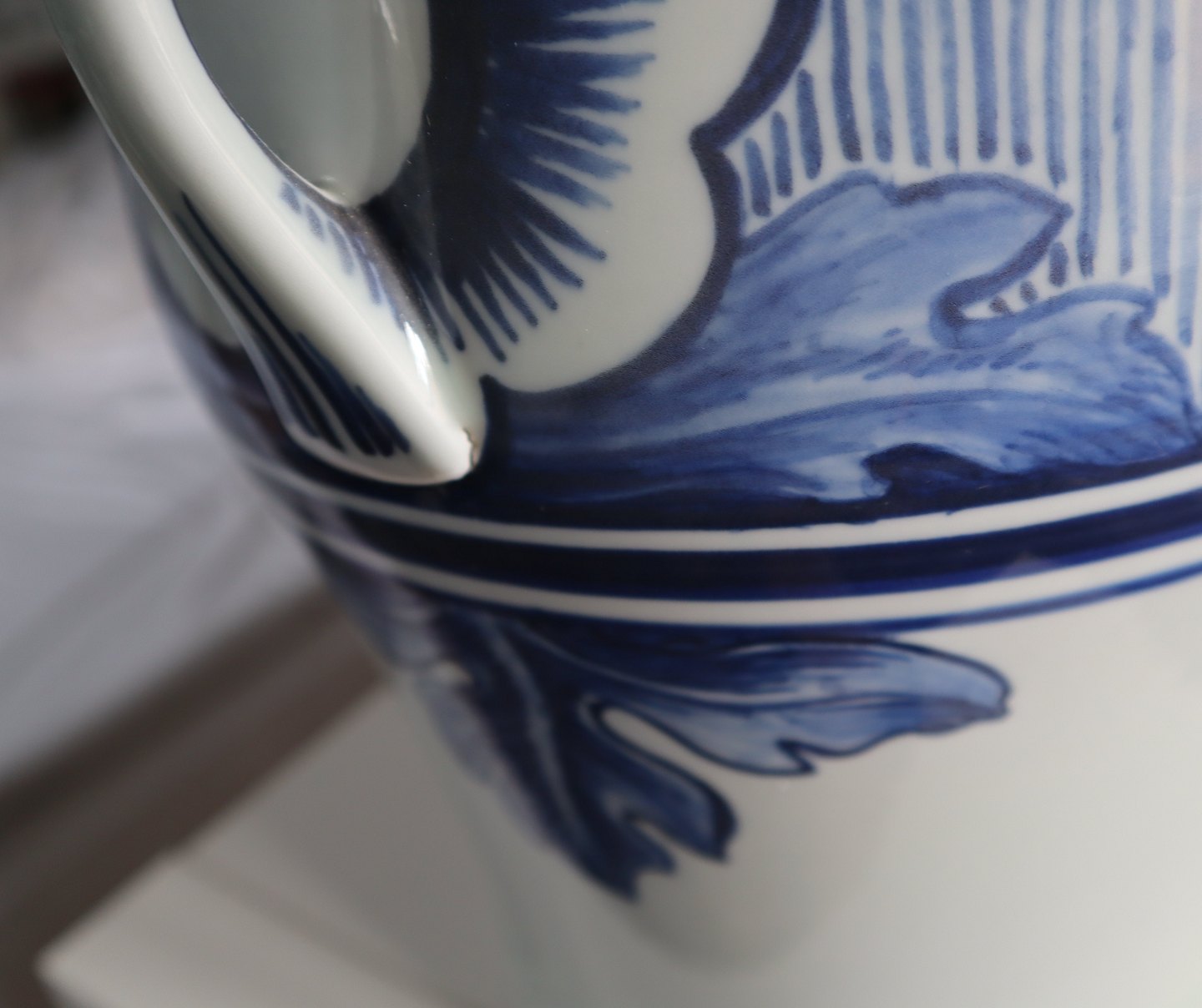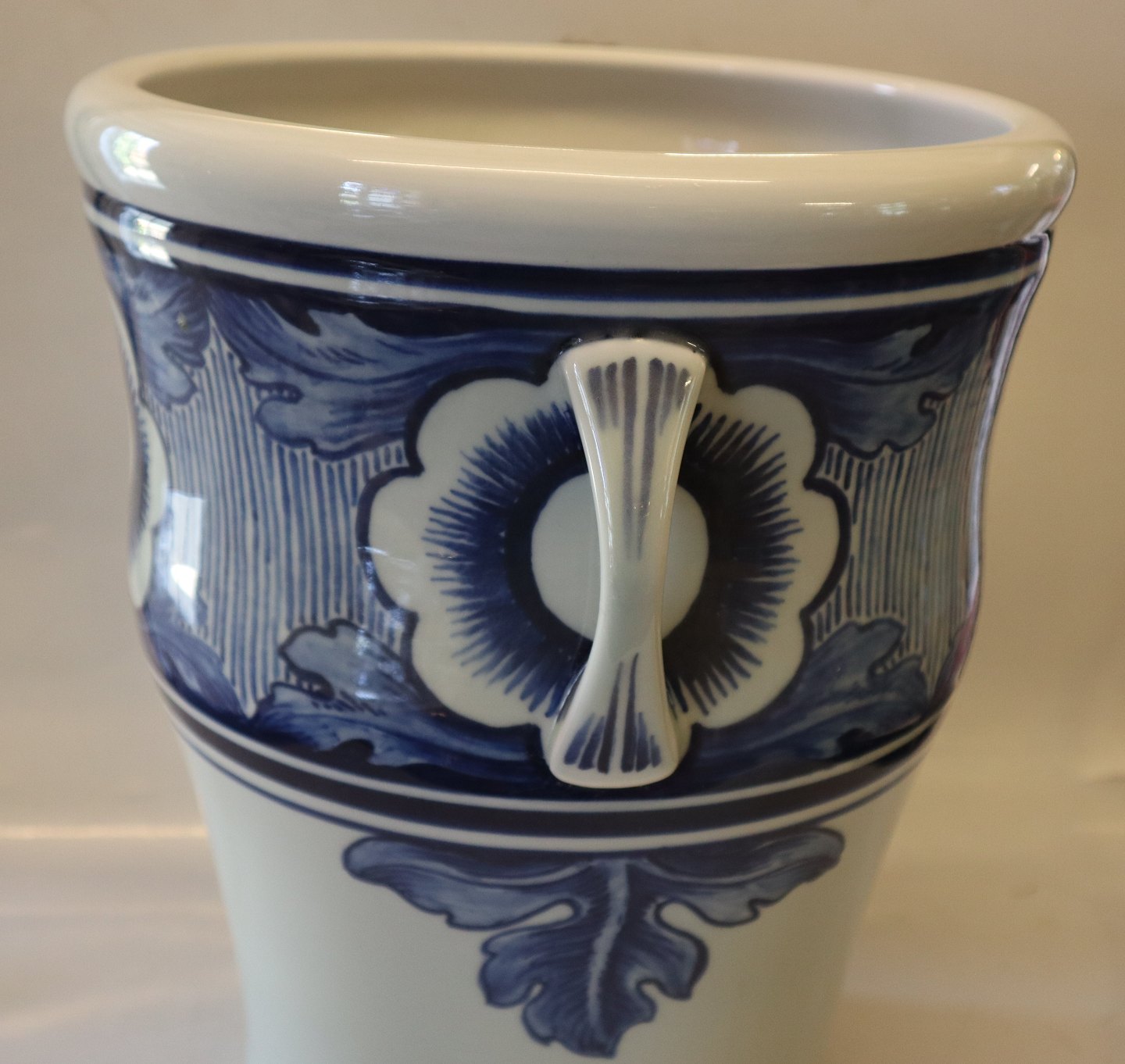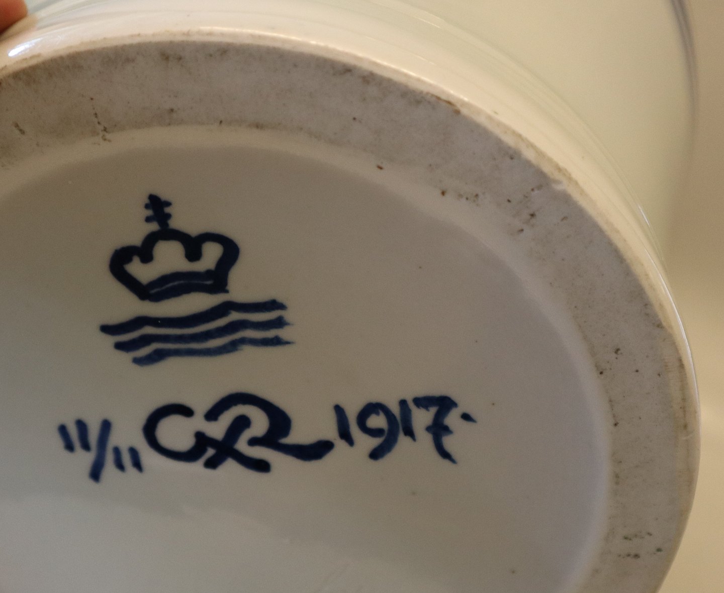 Beskrivelse: Kongelig Dansk Gulvvase med hanke 35 cm Signeret Gotfred Rohde 11/11 1917 Blå Art Deco dekoration fra Royal Copenhagen I hel og fin brugt stand - født med lille brændingsrevne ved hank