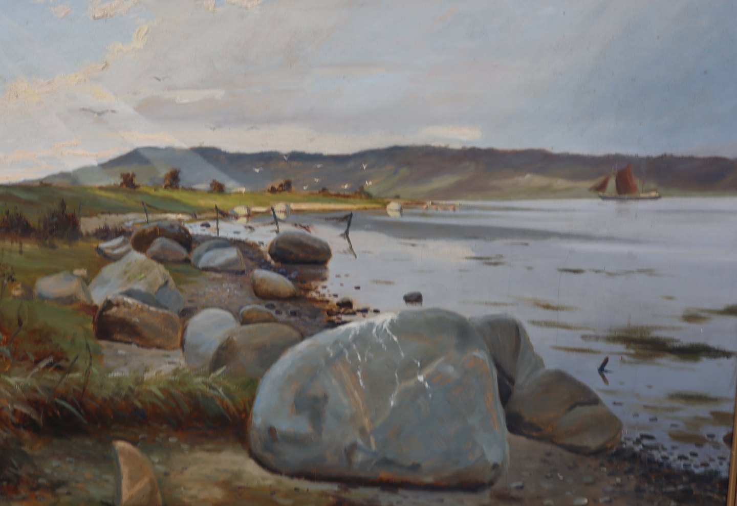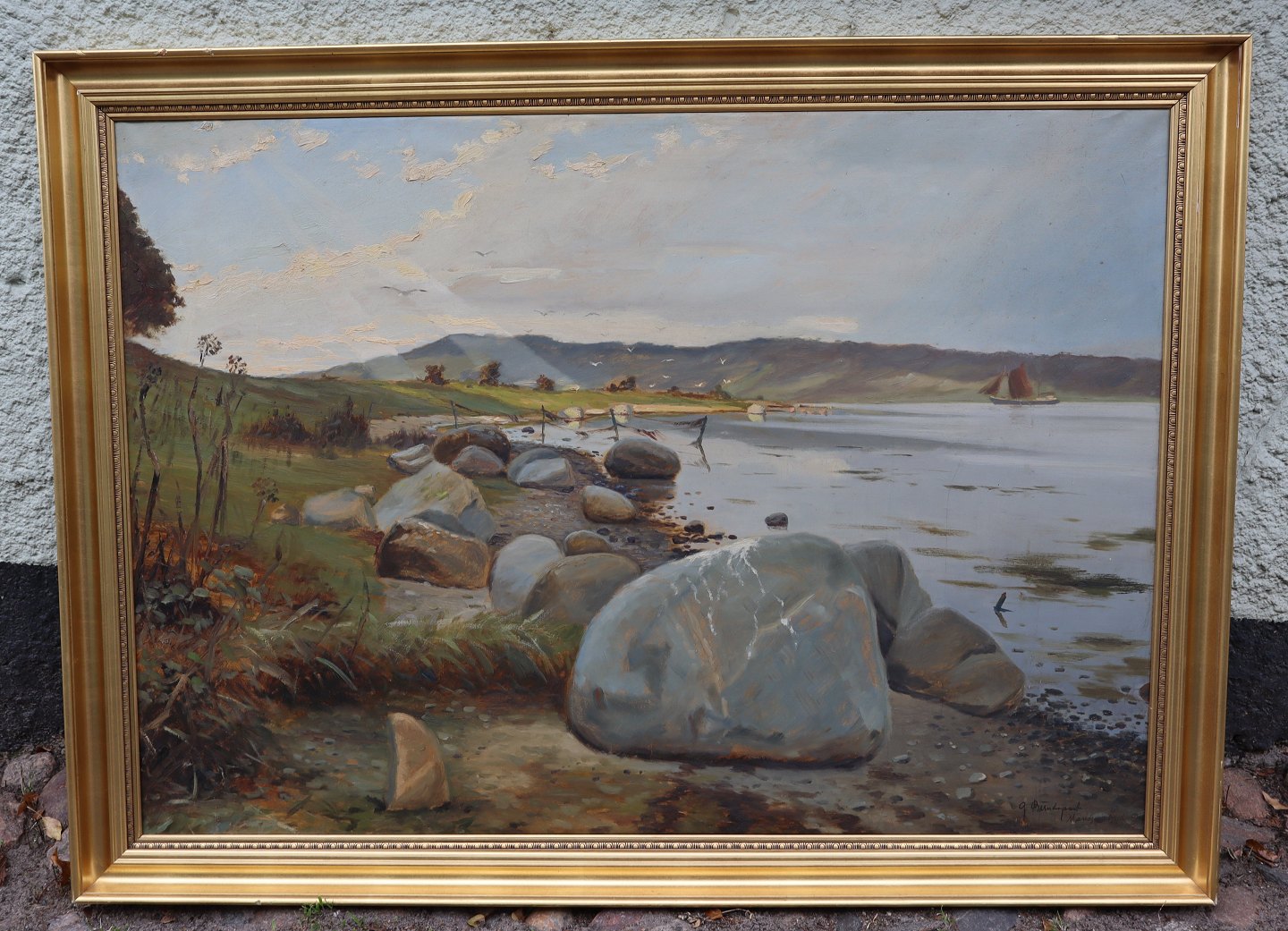 Færgehagen ved Mariagerfjord 1952 Stort Maleri af Gunnar Bundgaard 112 x 153 Cm med Guldramme