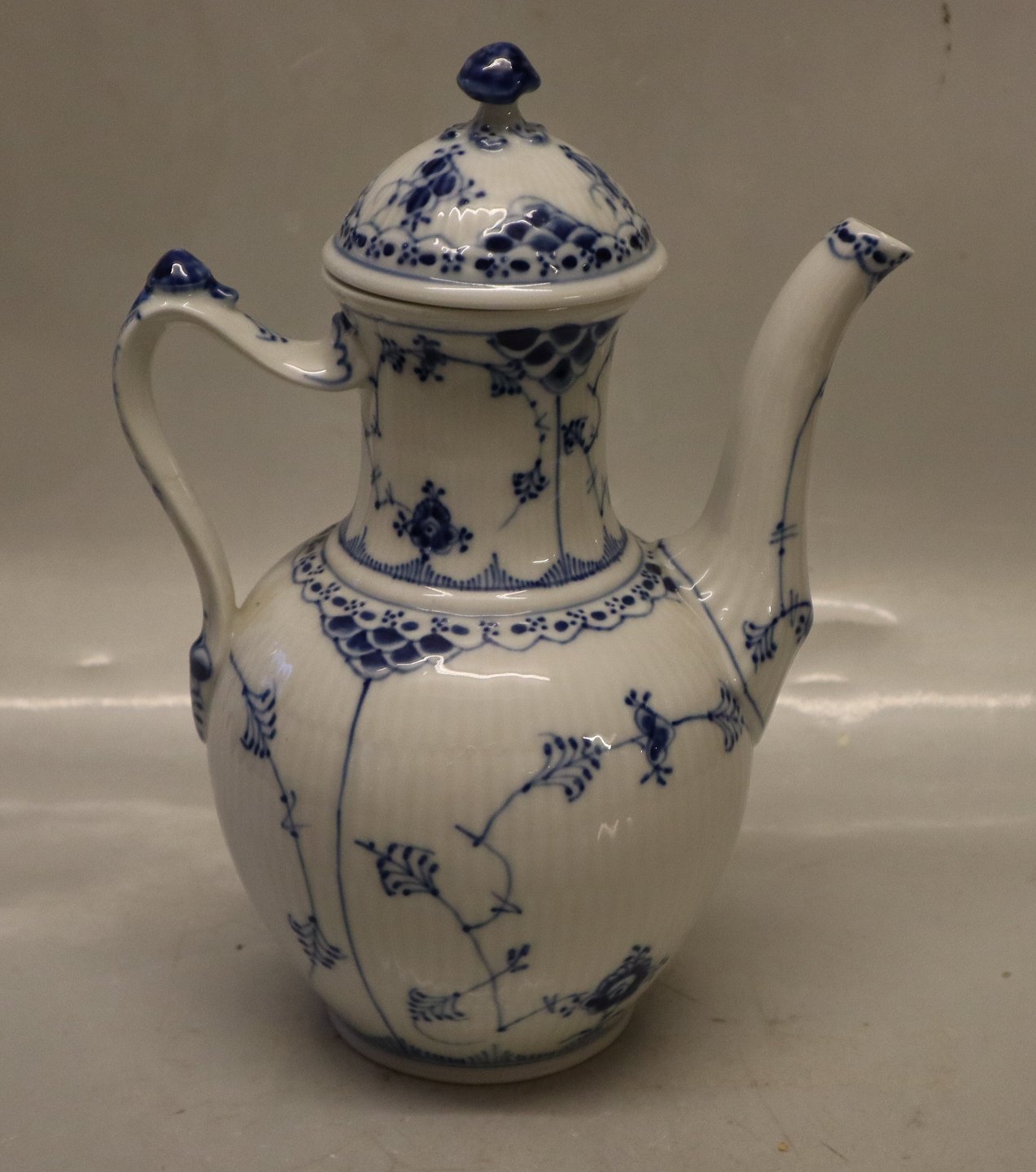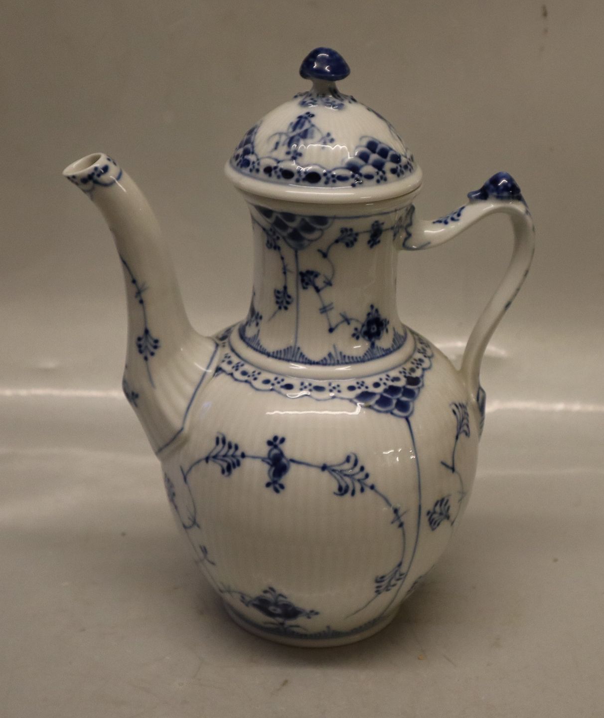 Kongelig Dansk Porcelæn 1-519 Kaffekande m/låg Musselmalet Halv blonde Ca 24 cm 0.96 liter. I fin og hel stand