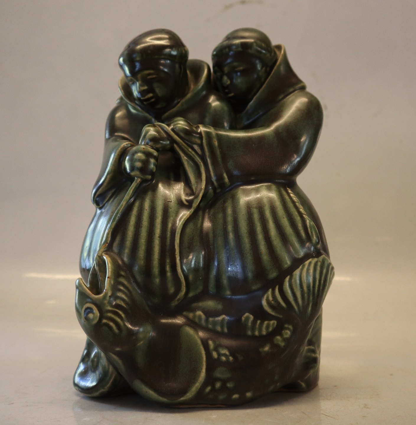 Beskrivelse: 1605 Kgl. To Munke med fisk 22 x 16 cm Signeret Georg Thylstrup 1913 Royal Copenhagen stentøj I fin og hel stand -lille fejl under bund