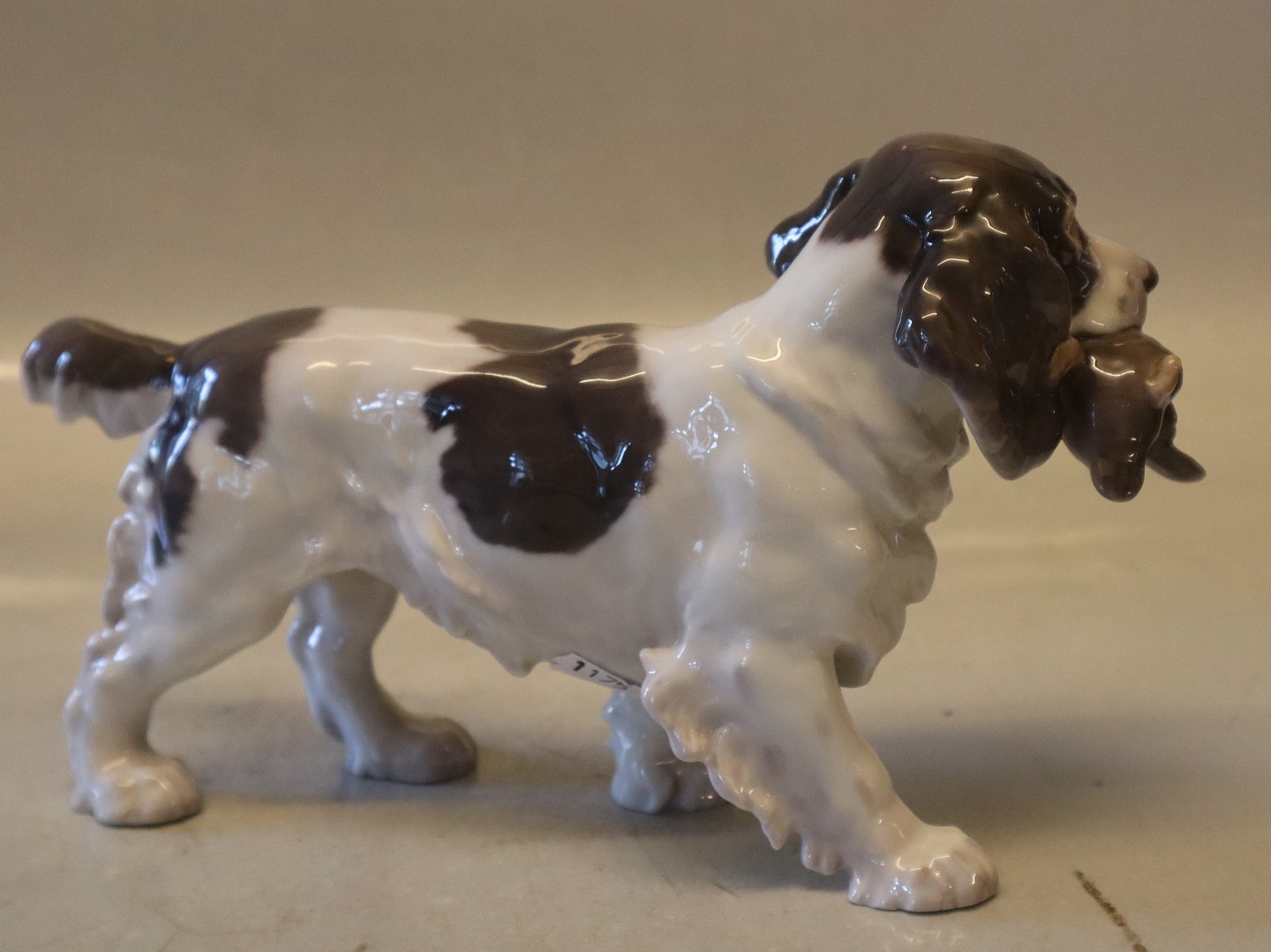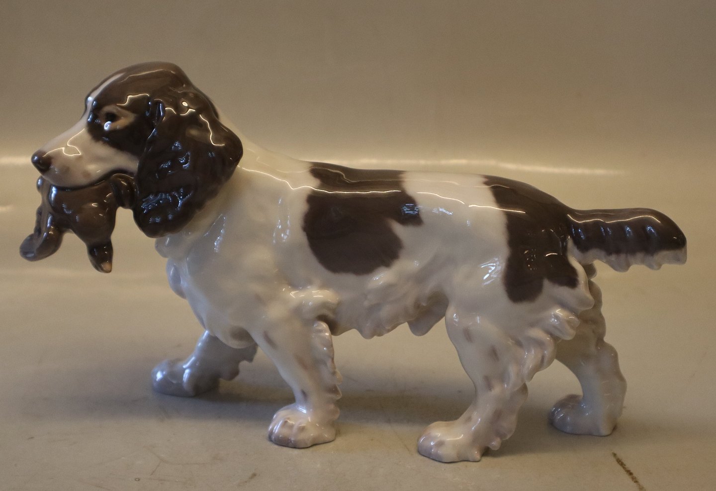 Beskrivelse: Bing & Grøndahl hund 2061 Spaniel med fugl 25 cm Lauritz Jensen arbejde både for Royal Copenhagen, Dahl Jensen og Bing & Groendahl Jagthund