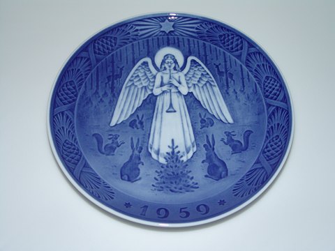 Beskrivelse: Royal Copenhagen Juleplatte (Kongelig, kgl) fra 1959 "Engel spiller for skovens dyr". Designed af Hans Henrik Hansen. I fin og hel stand. Første sortering.