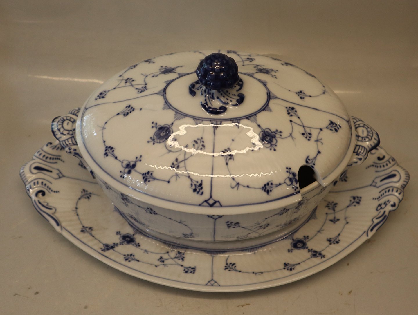 214-1 Terrin, oval, 12 pers. 19 x 20.5 x 32.5 cm Royal Copenhagen Musselmalet riflet . Muselmalet I fin og hel stand. Passer godt sammen med andre blåmalede spise- og kaffestel