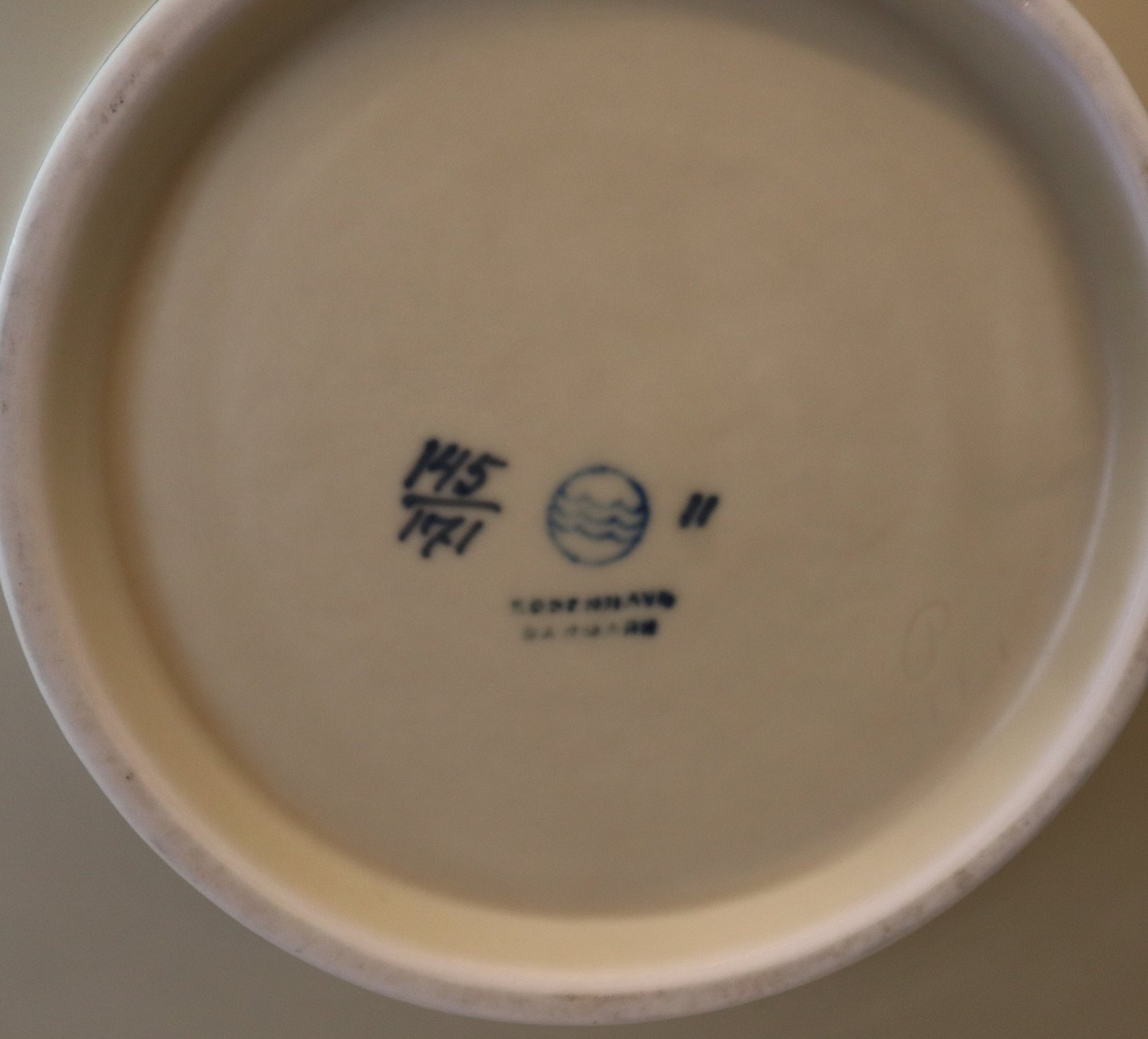 145-171 Kgl. Stor frugtskål med ananas og druer 7.5 x 30 cm Royal Copenhagen Aluminia Mat Porcelæn (Blødt porcelæn med mat glasur) Design samarbejde mellem Olaf Mathiesen og Nils Thorsson 1927-1932
