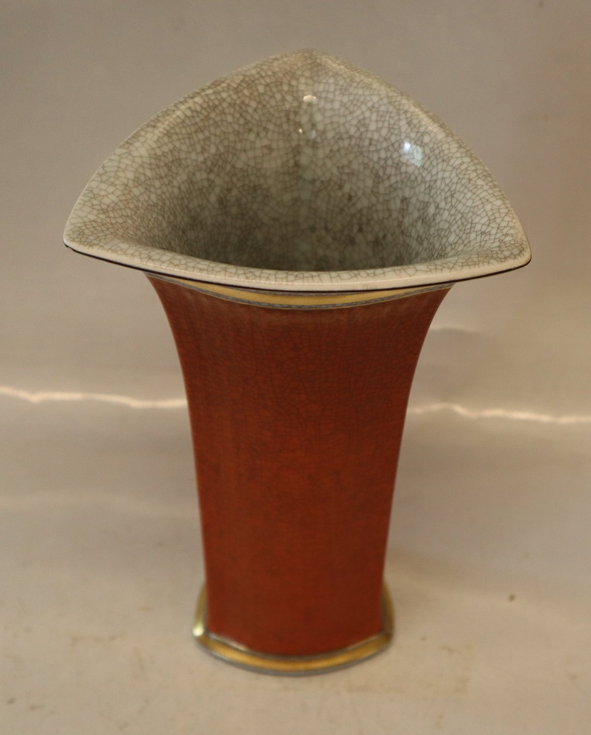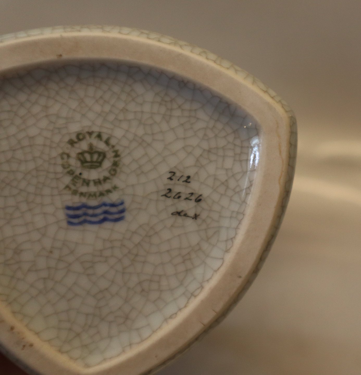 Beskrivelse: 212-2626 Kgl. Trekantet orange på gråt med guld 23 cm Craquelé fra Royal Copenhagen I hel og fin stand