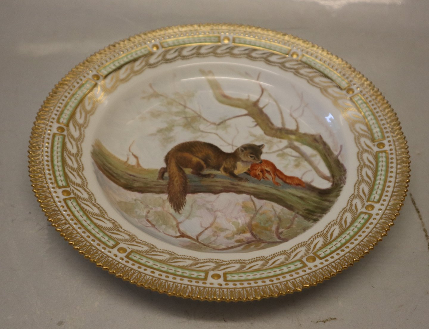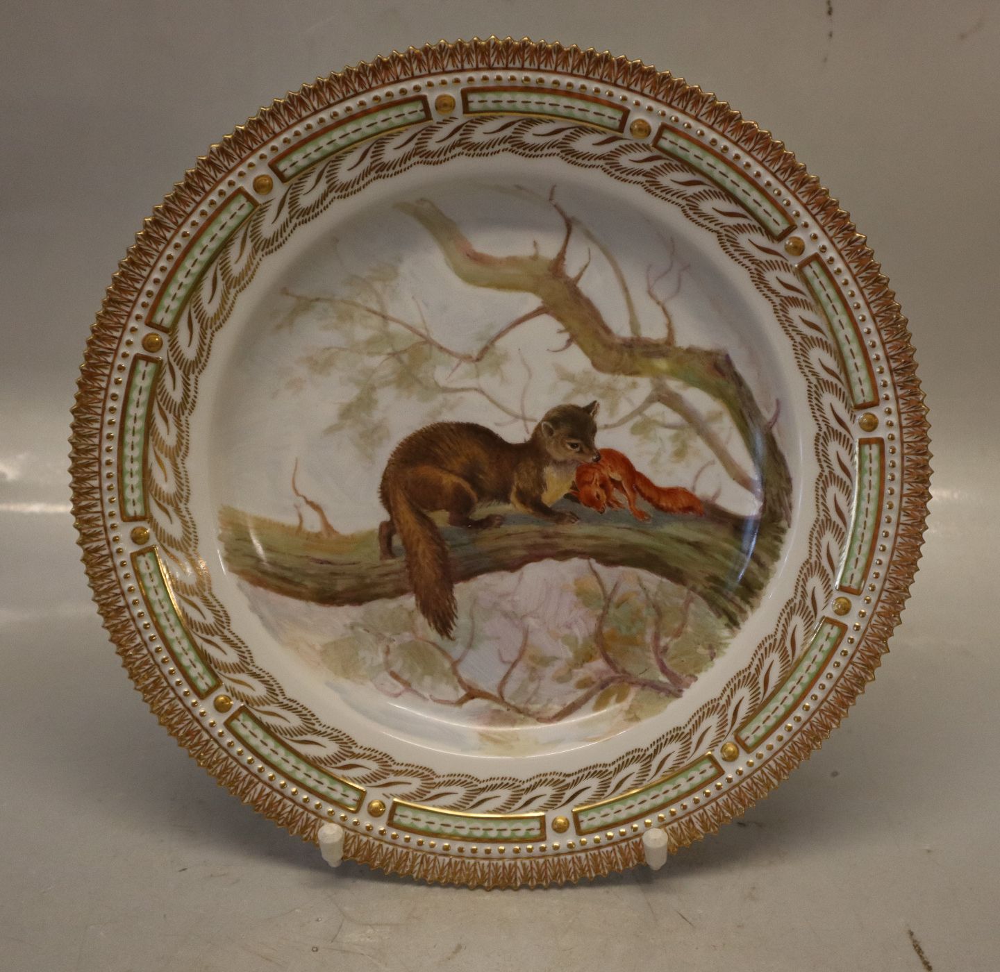 Beskrivelse: 239-3549 Fauna Danica Middagstallerken 25 cm: Husmår "Mustella martes". Nyt# 624 Royal Copenhagen jagtplatte på middagstallerken, Fauna Danica 1. sortering på guldbelagt Flors Danica perlestel. i fin og hel stand