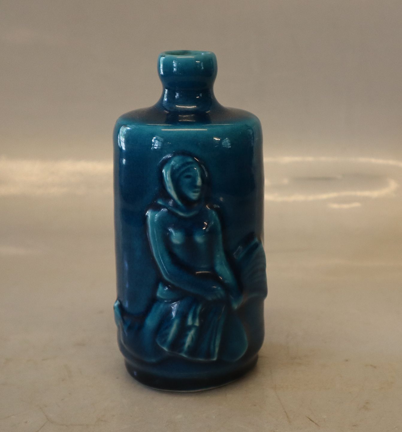 RC Turkis flaske 14 cm med releif af høstfolk Signeret Jais Kongelig Dansk Stentøj