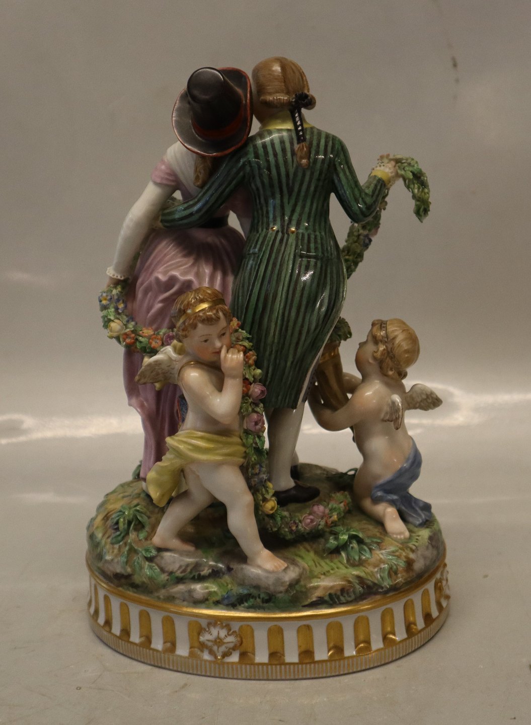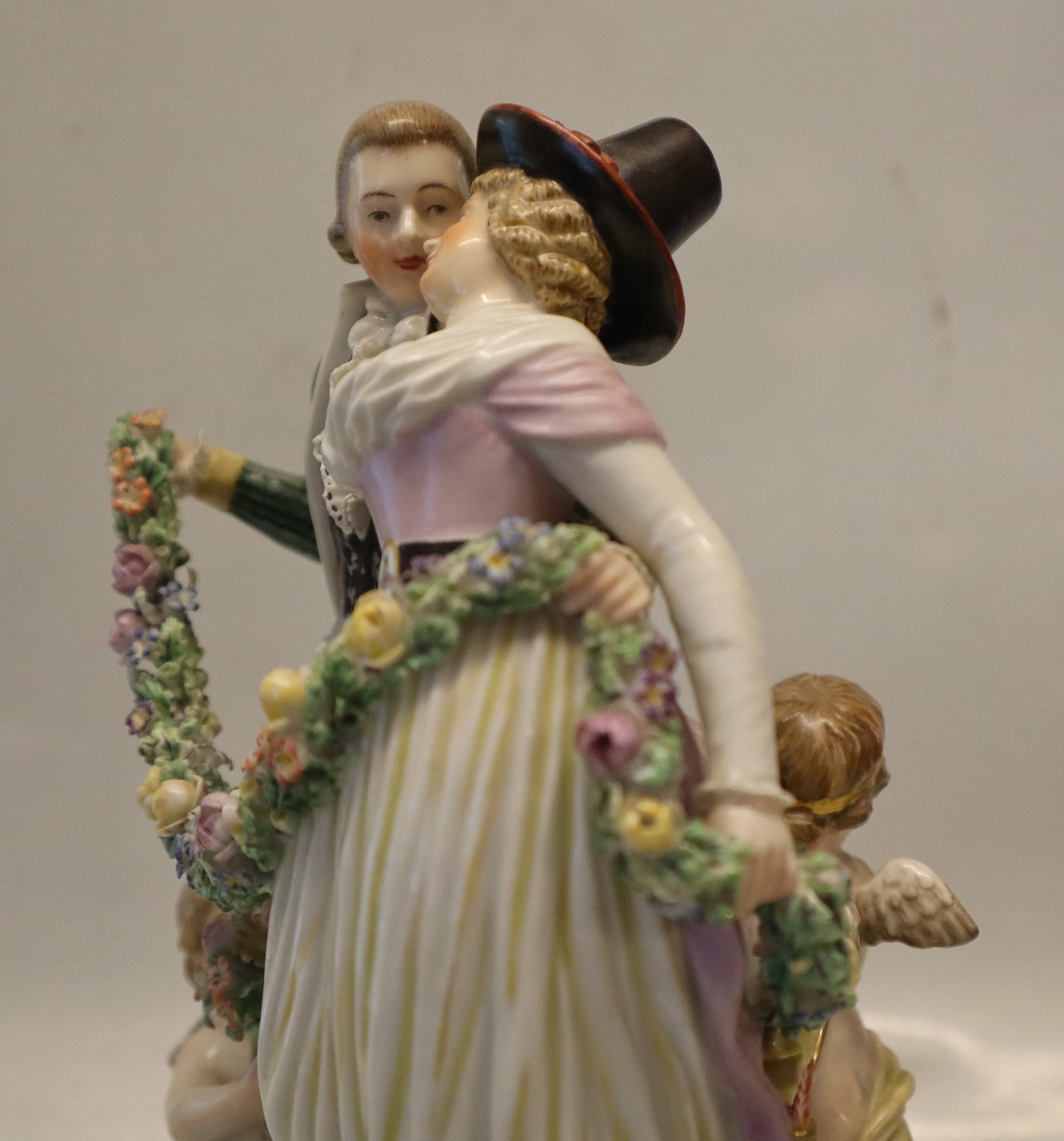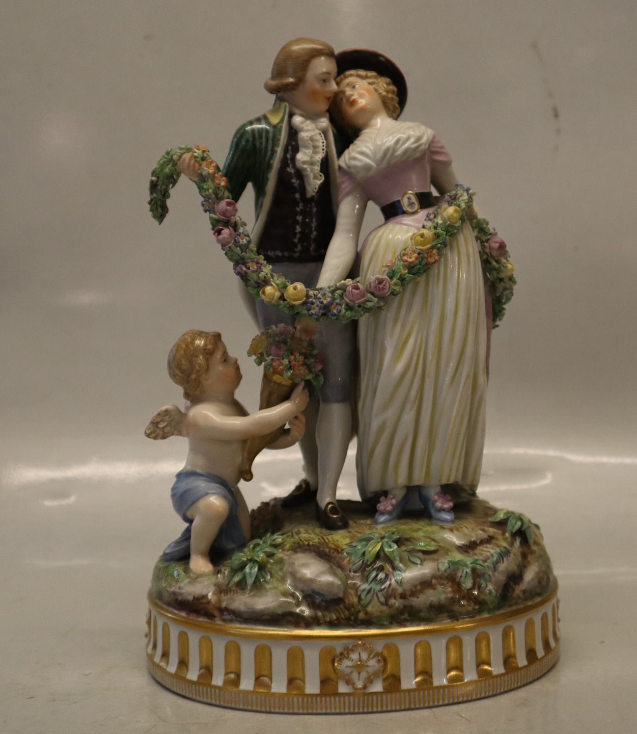 Beskrivelse: 12154 Kgl. Kærlighedsgruppe: Victoriansk par med cupido´er 24 x 17 cm blomsterguirlander med pousserende blomster fra Royal Copenhagen I hel og fin stand Stemplet med Juliane Marie mærket