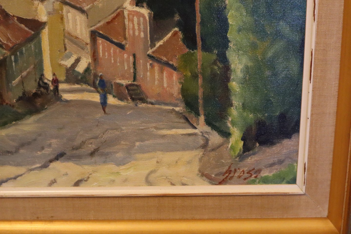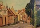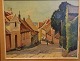 Maleri: Gunnar Bundgaard 1959 Motiv fra Den Gamle By Mariager ved Mariagerfjord - Fuglsangsgade, Apotekergaarden ca 50 x 60 cm