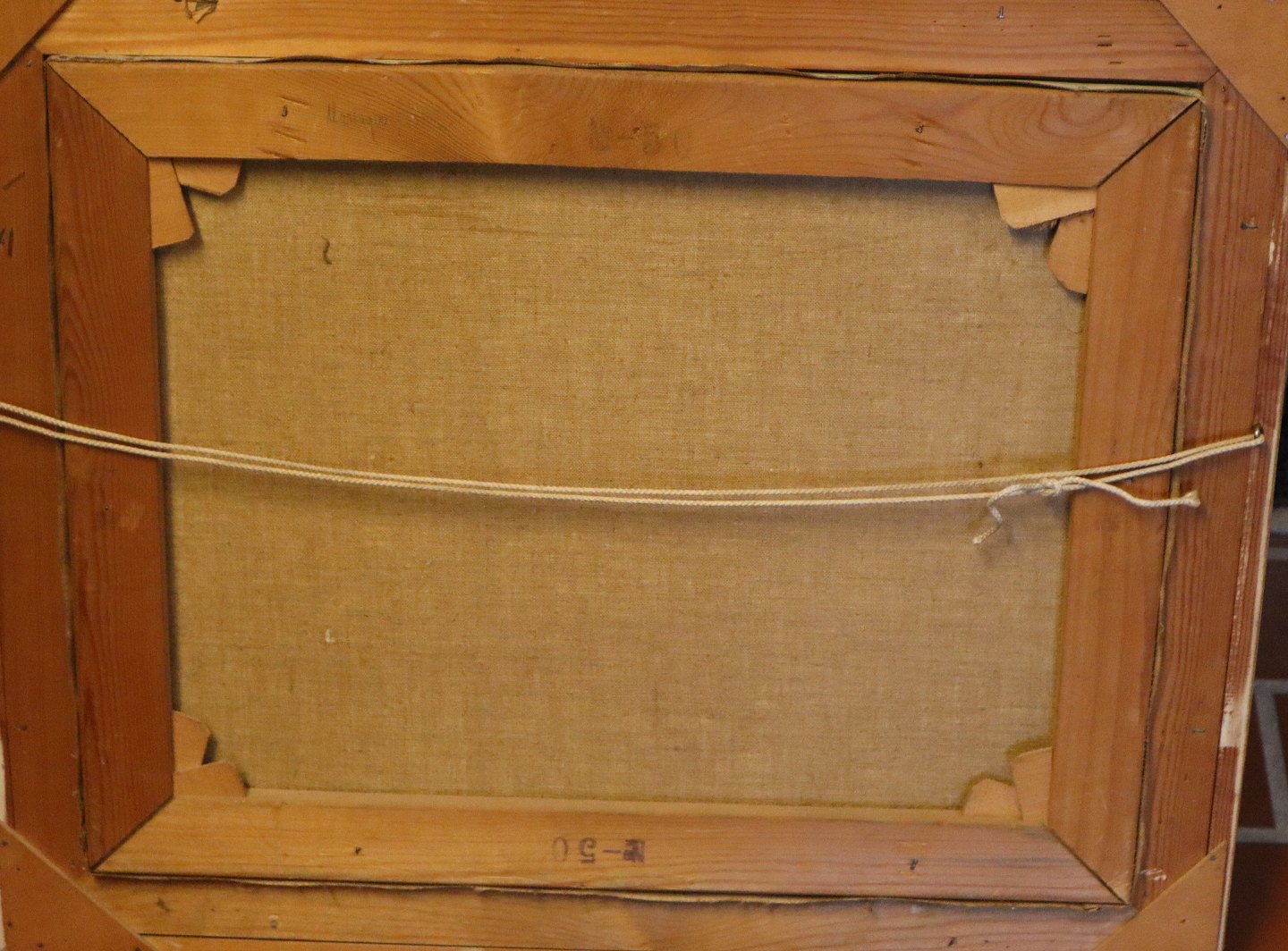 Beskrivelse: Maleri: Gunnar Bundgaard 1959 Motiv fra Den Gamle By Mariager ved Mariagerfjord - Fuglsangsgade, Apotekergaarden ca 50 x 60 cm Olie på lærred - gammel guldramme