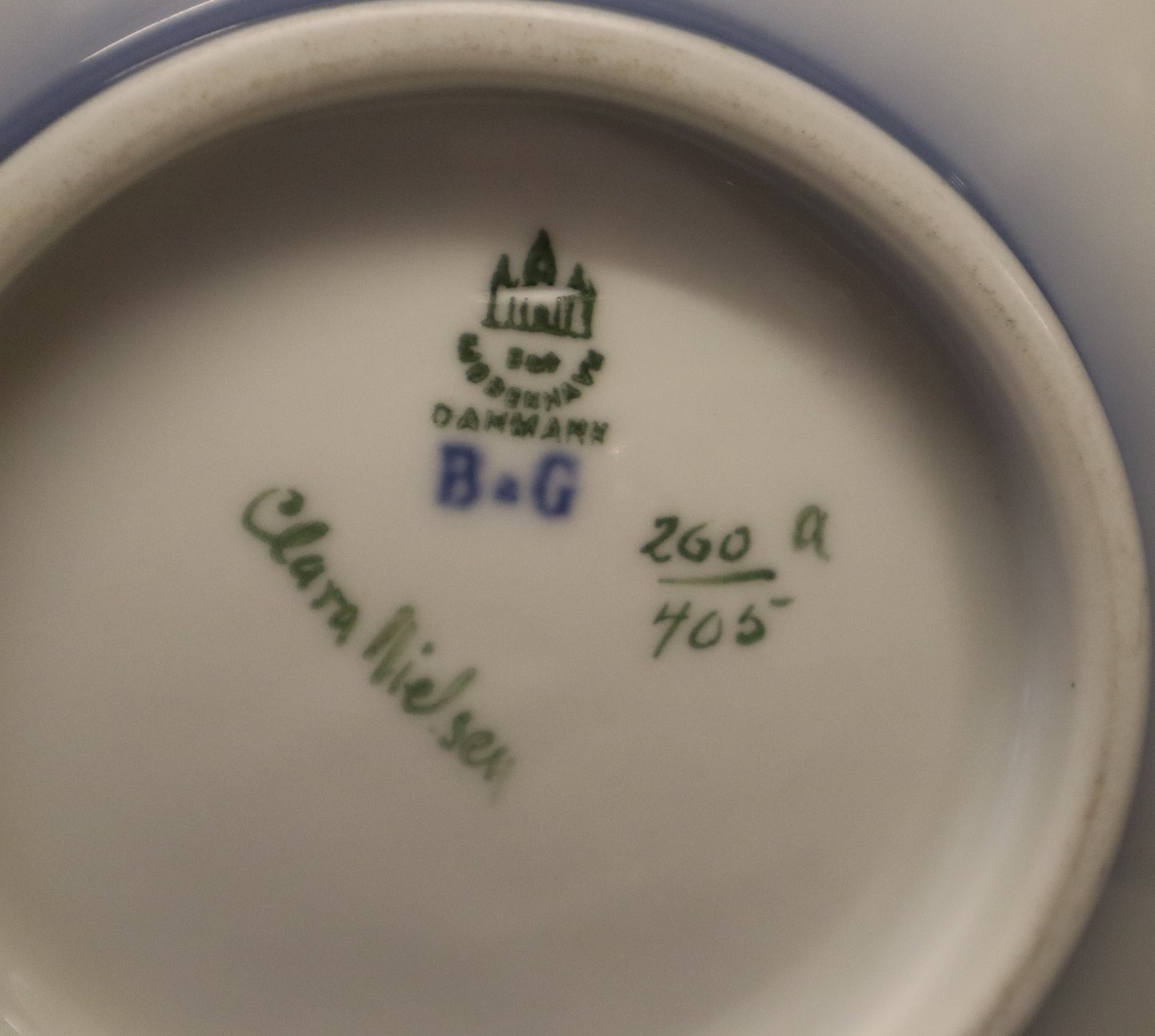 Beskrivelse: B&G 260 - 405 A Stort fad ca. 35 cm Blomster dekoreret og signeret Clara Nielsen Bing & Grøndahl Lille skår på kanten eller i fin stand.