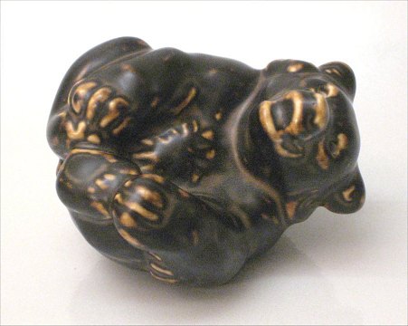 glaseret Kongelig Dansk Stentøj 0245 Brun bjørneunge på ryggen 9 cm Design Jeanne Grut after KK