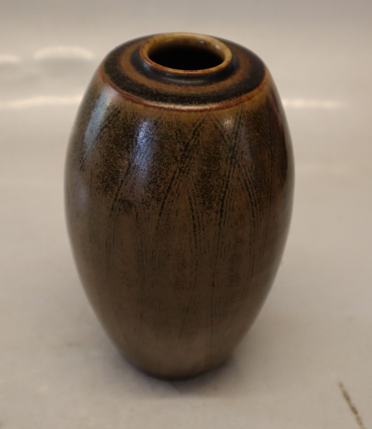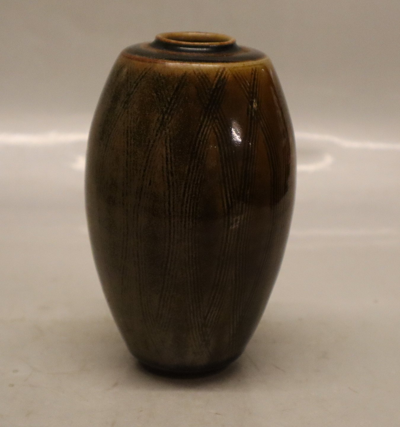 Beskrivelse: Kgl. Nils Thorsson Vase brun glasur med stregmønster 14 cn