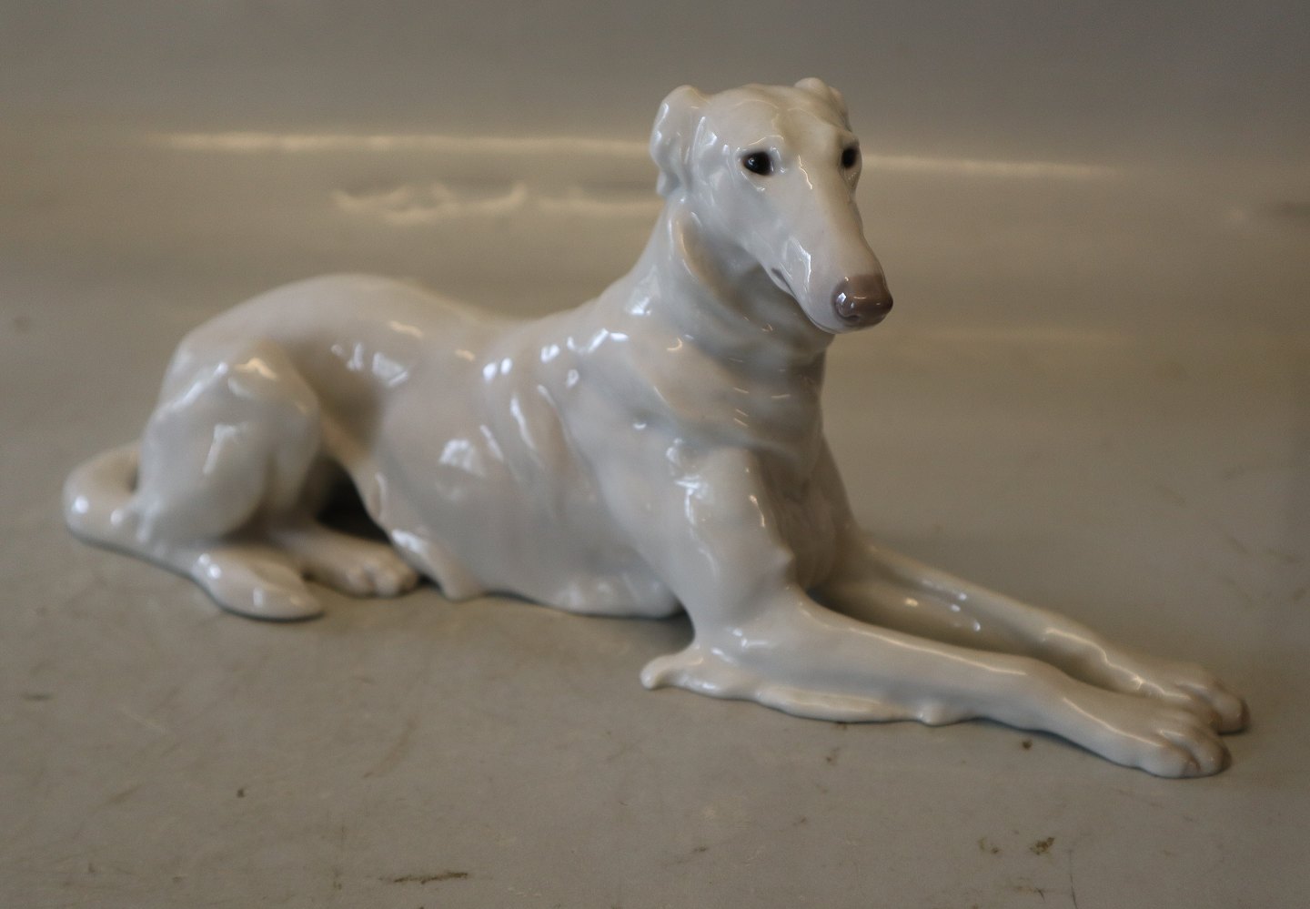 Beskrivelse: Bing & Grøndahl Hund B&G 1811 Liggende hvid mynde 12.5 x 29 cm Lauritz Jensen 1913 I fin og hel stand