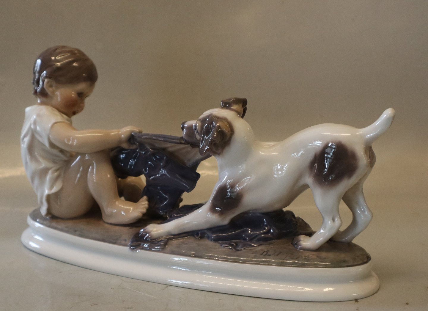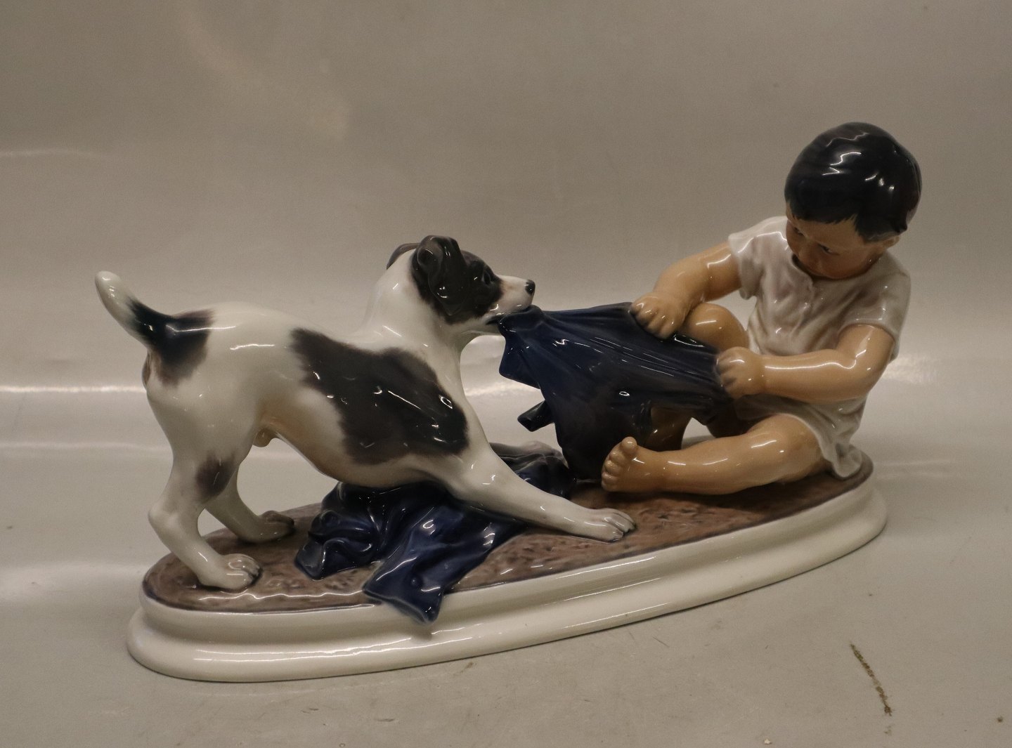 Dahl Jensen 1072 Glathåret foxterrier i leg med dreng (DJ) 32.5 cm Mærket med kongelig krone og DJ Copenhagen 1. sort. i hel og fin stand.