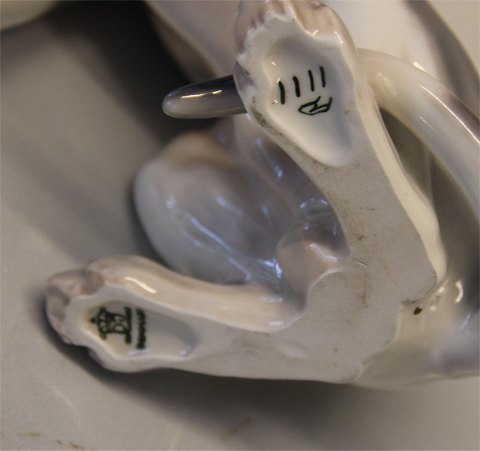 Beskrivelse: Dahl Jensen. 1111 Great Dane, stående (DJ) 26 cm 2. sortering Mærket med kongelig krone og DJ Copenhagen i hel og fin stand.