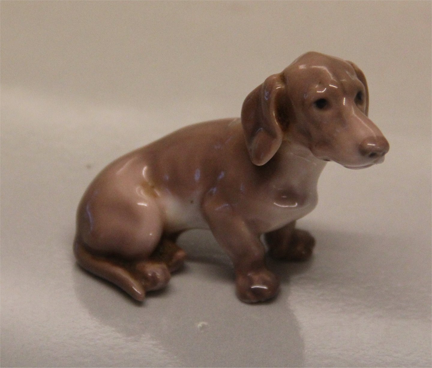 Beskrivelse: Dahl Jensen. 1131 lille grævlingehund (DJ) 6.5 cm Mærket med kongelig krone og DJ Copenhagen i hel og fin stand.