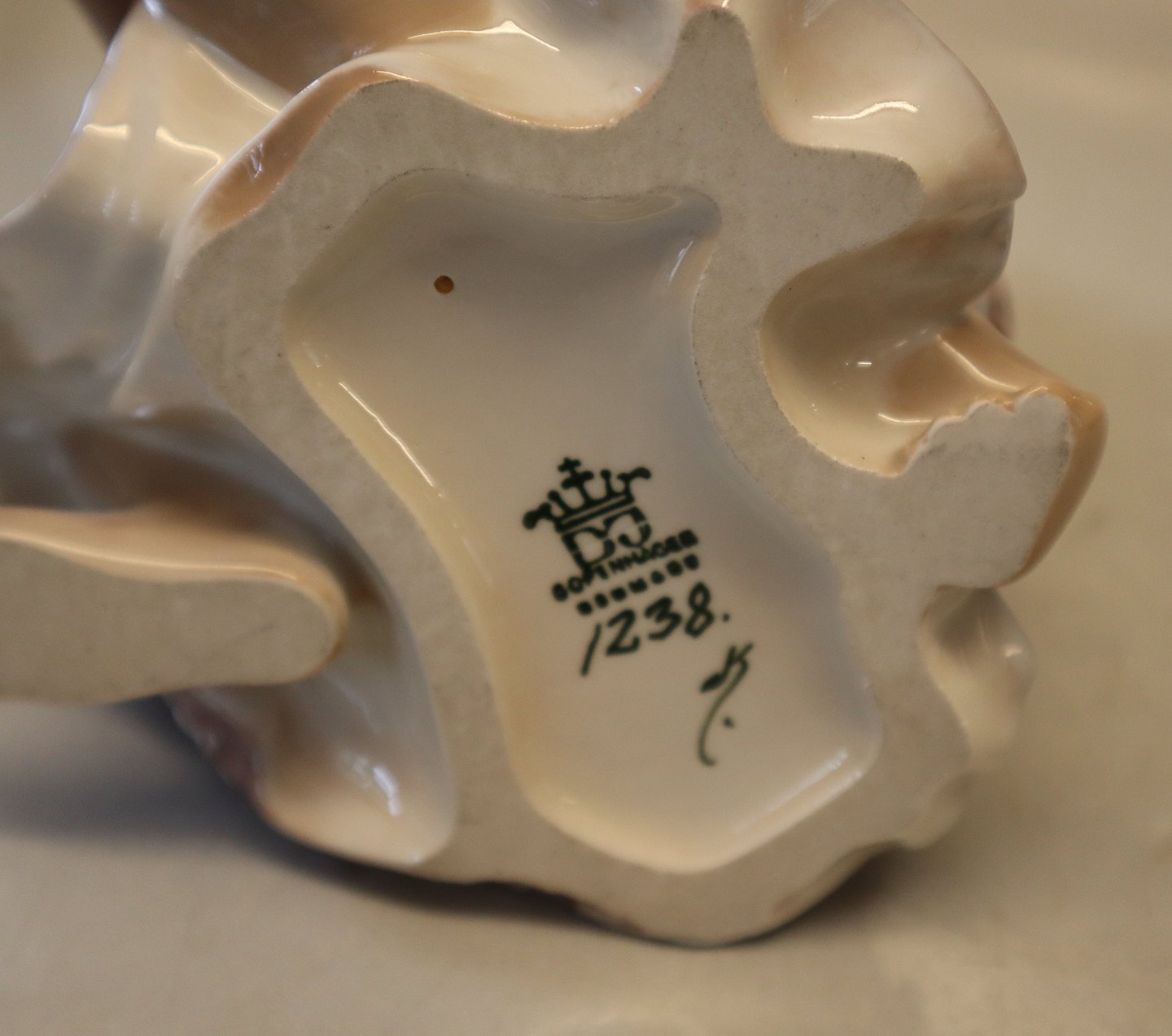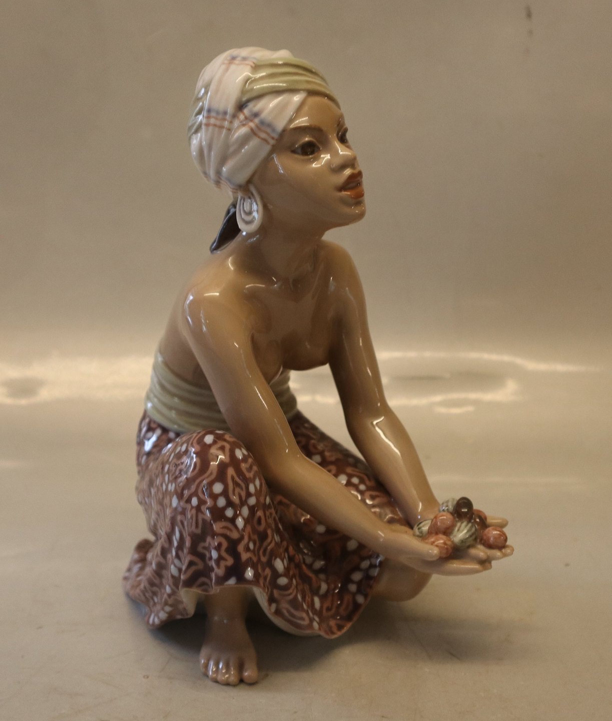 Beskrivelse: Dahl Jensen. 1238 Frugtsælgersken fra Bali (DJ) 21 cm Mærket med kongelig krone og DJ Copenhagen i hel og fin stand.