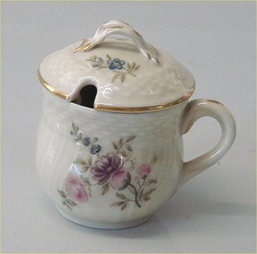 Beskrivelse: Royal Copenhagen Frijsenborg 1594-910 Sennepskande 8 cm Blomstermotiver på svejfet stel med guldkant.
